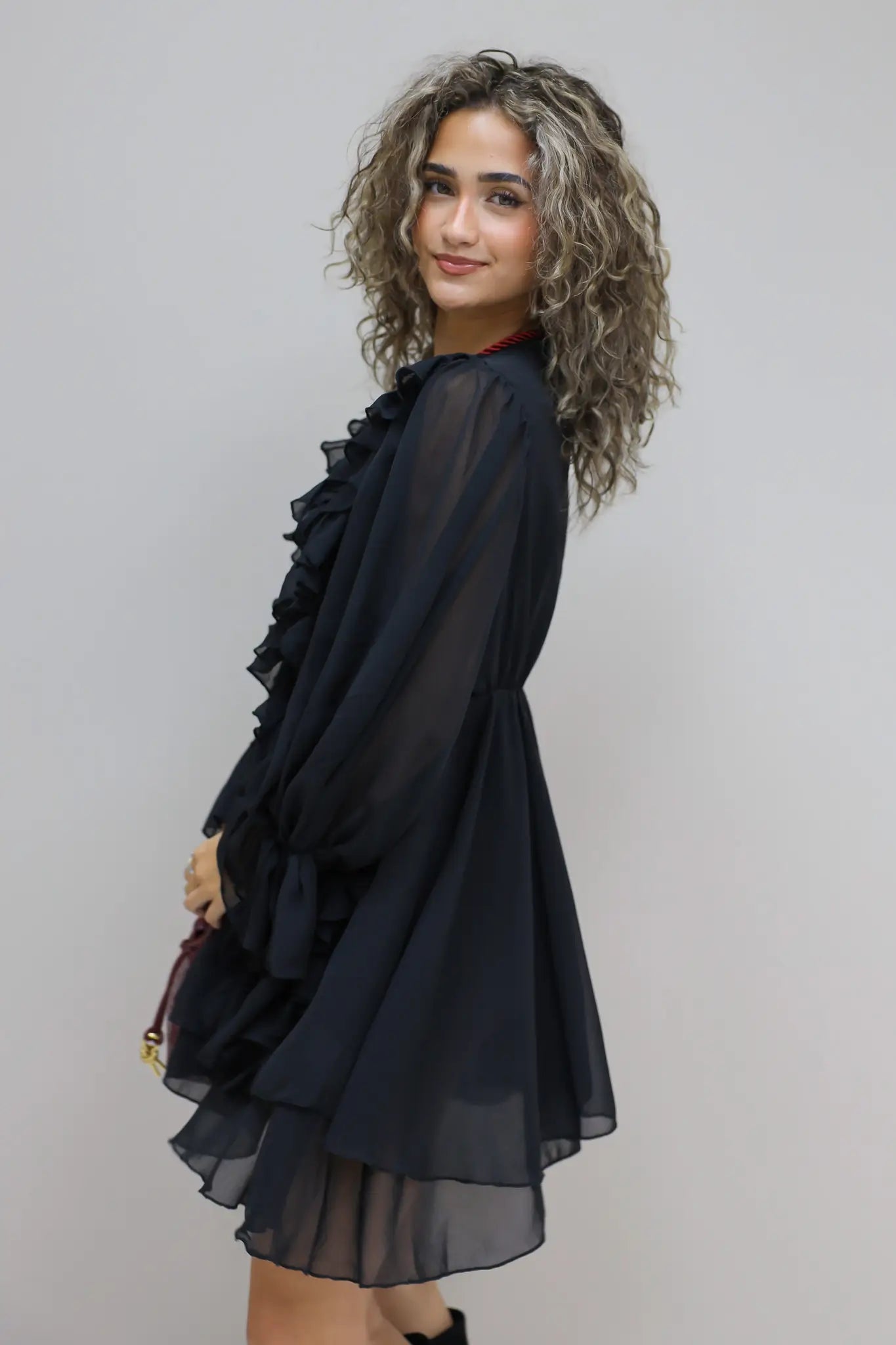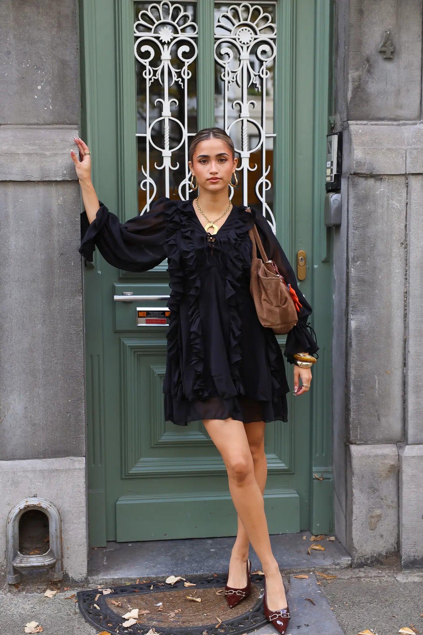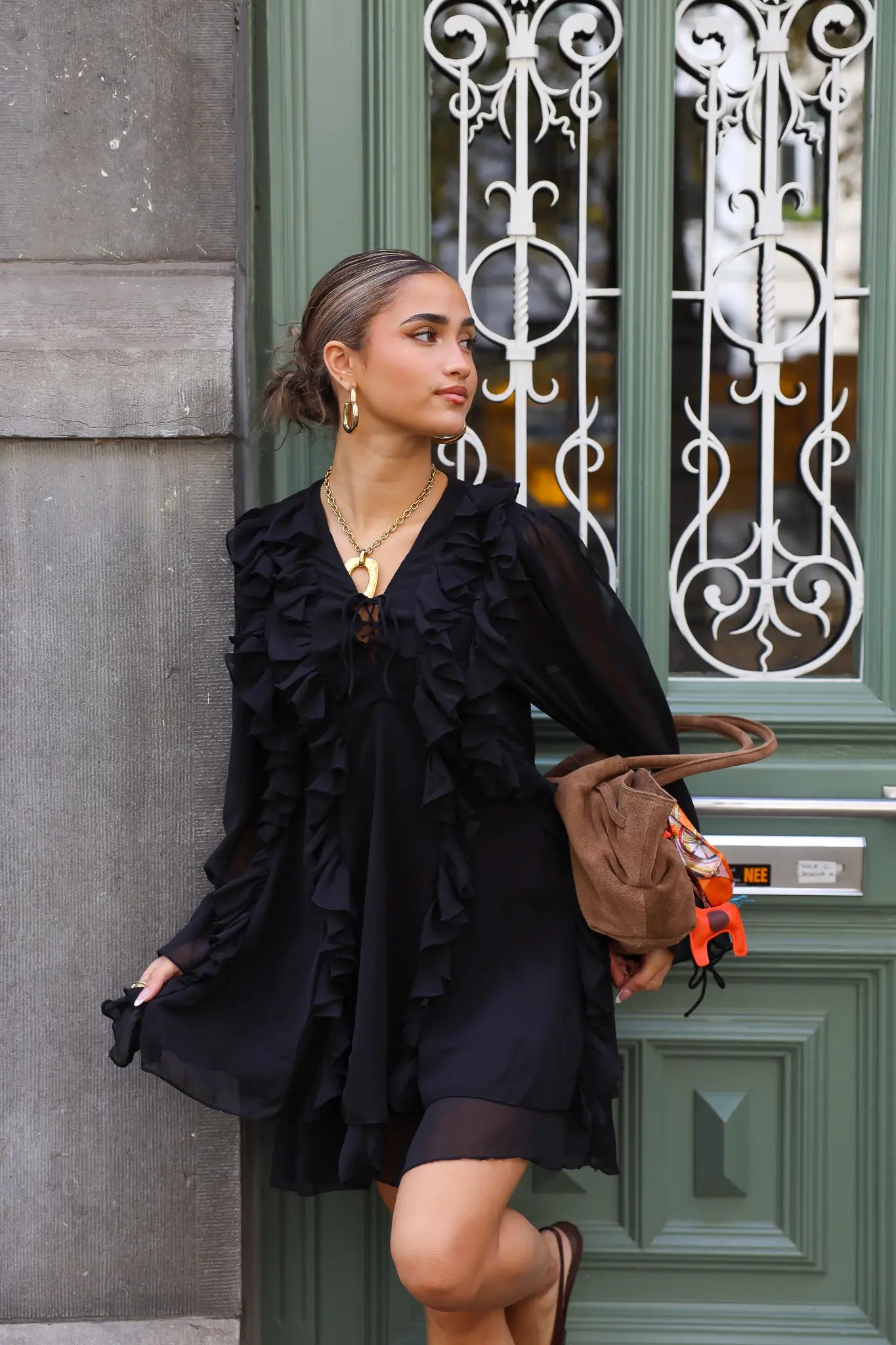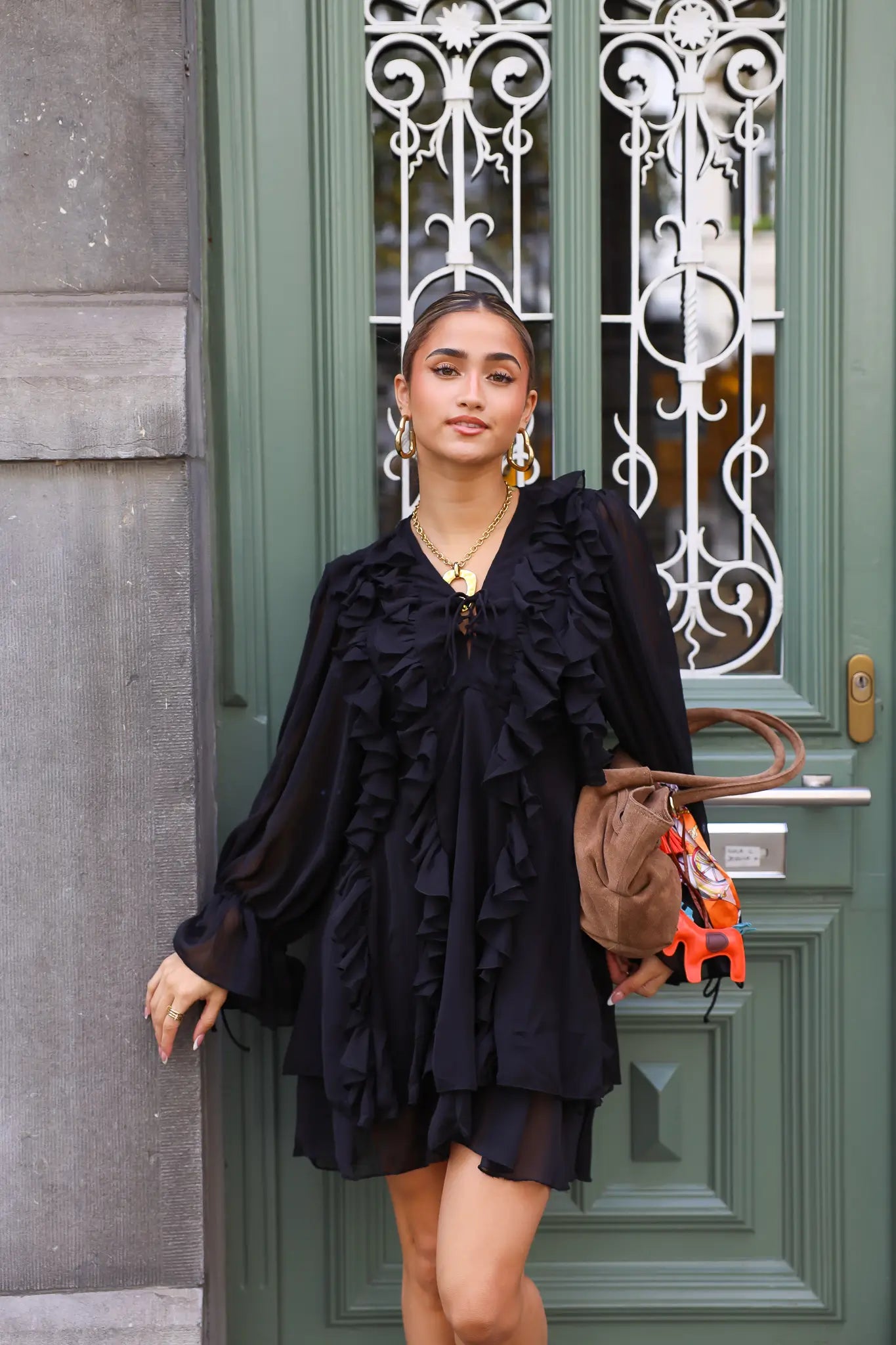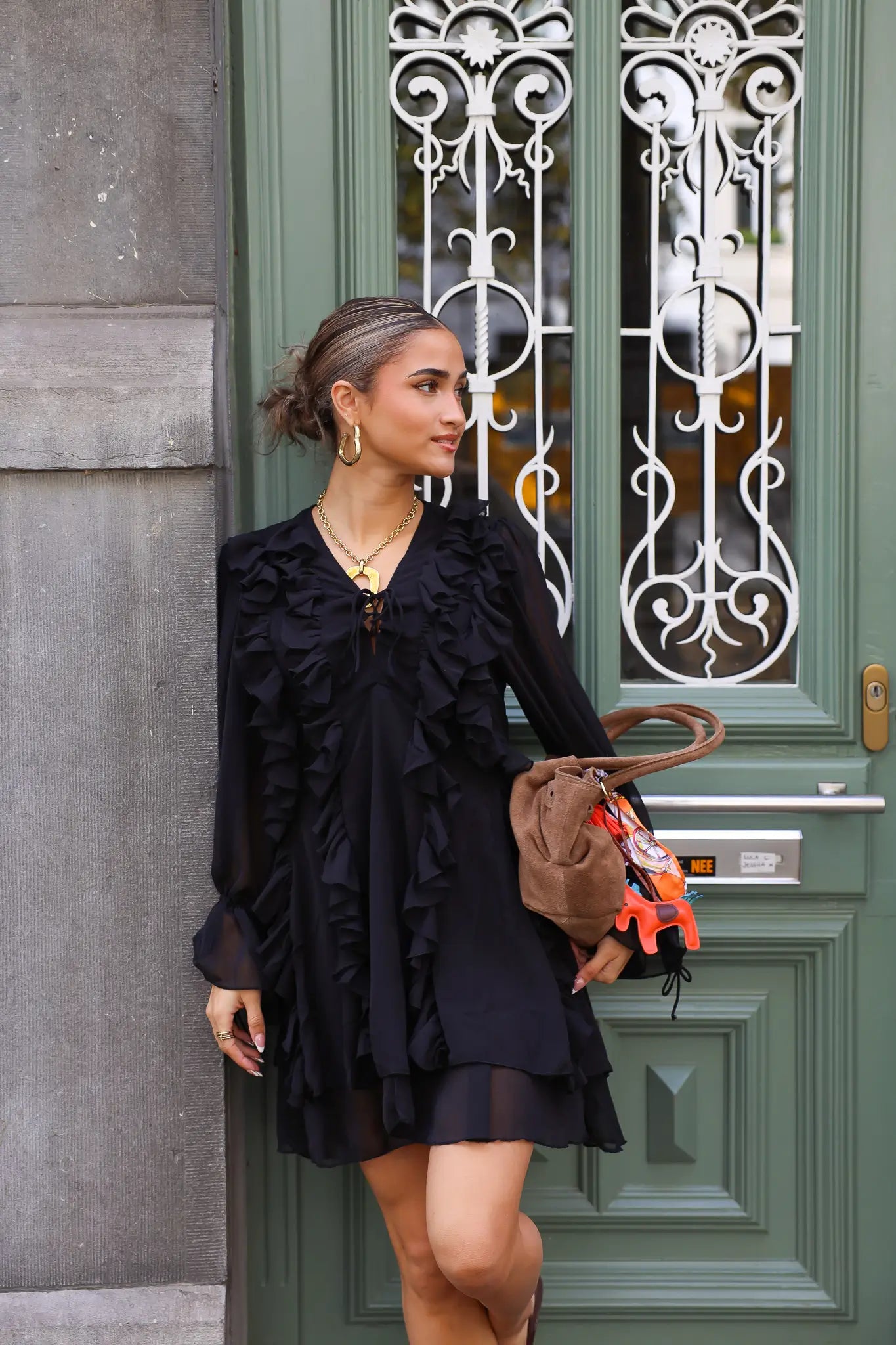 Een ruffle jurk in zwart is niet zomaar een jurk. Het is een kledingstuk dat je makkelijk aantrekt voor verschillende gelegenheden. Of je nu een terrasje pakt, gaat shoppen of een feestje hebt, je bent altijd goed gekleed. De ruffles geven net wat extra flair.