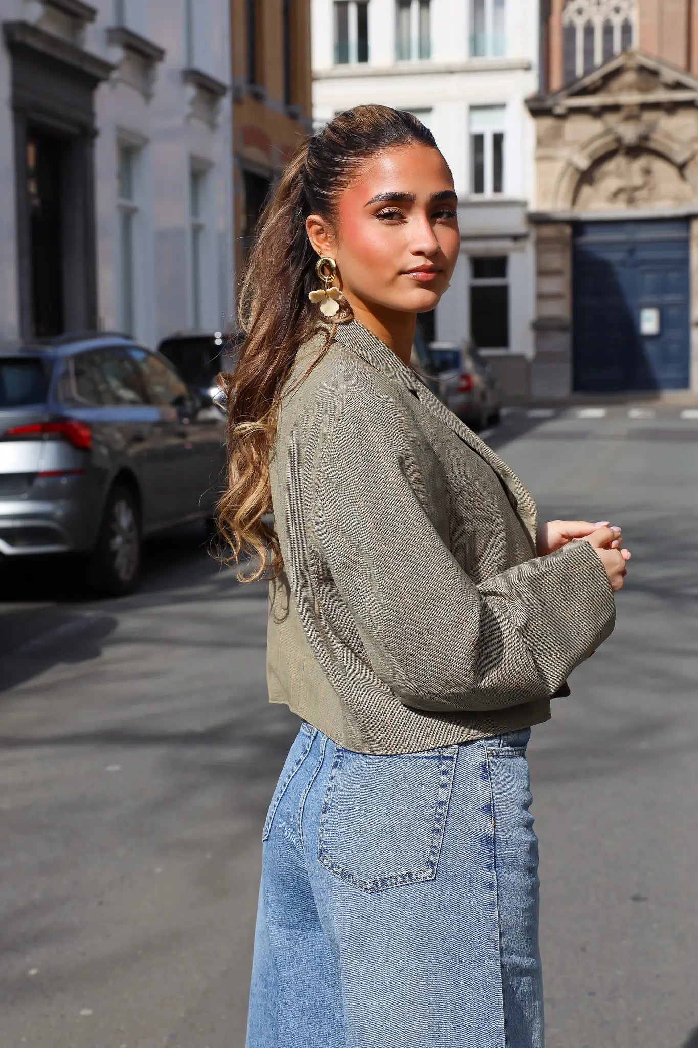 Dit is zo’n stuk dat je outfit meteen karakter geeft. Je ziet dat het geen standaard blazer is. De structuur van de stof, de ruit en het korte silhouet zorgen ervoor dat hij meteen opvalt.