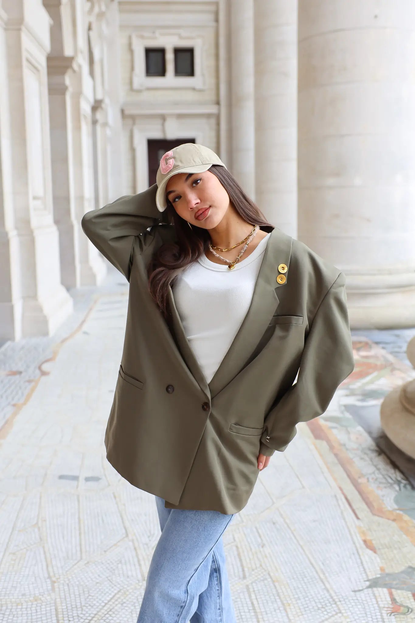 Zoek je op termen als khaki oversized blazer dames, reworked blazer groen of double breasted blazer dames? Dan sluit dit model daar perfect op aan.