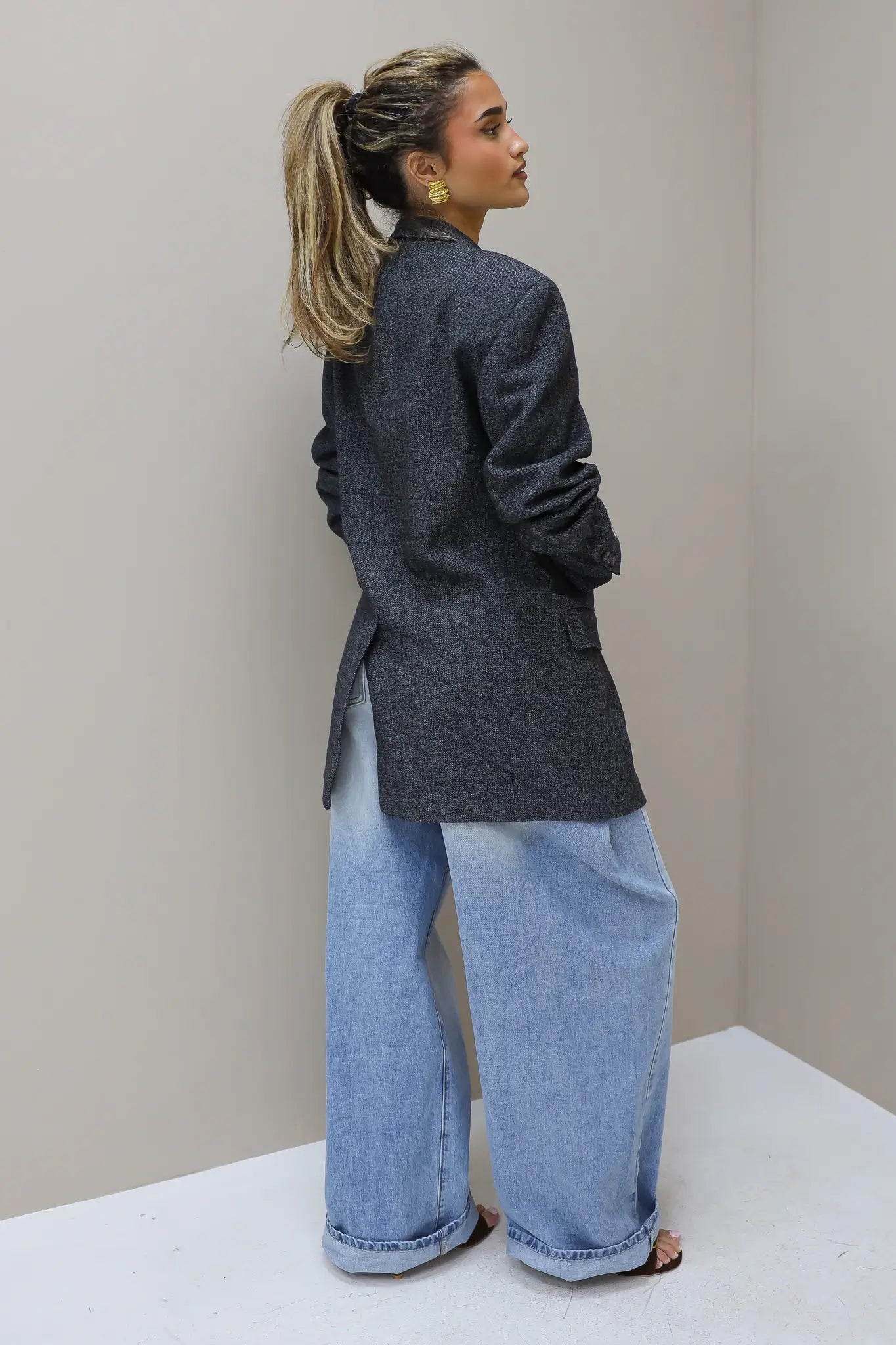 Met een lengte van ongeveer 80 cm valt hij mooi over de heup. De schouderbreedte van circa 49 cm zorgt voor structuur. Dit is een oversized blazer blauw dames die je zowel open als dicht kunt dragen, afhankelijk van hoe je hem styled.