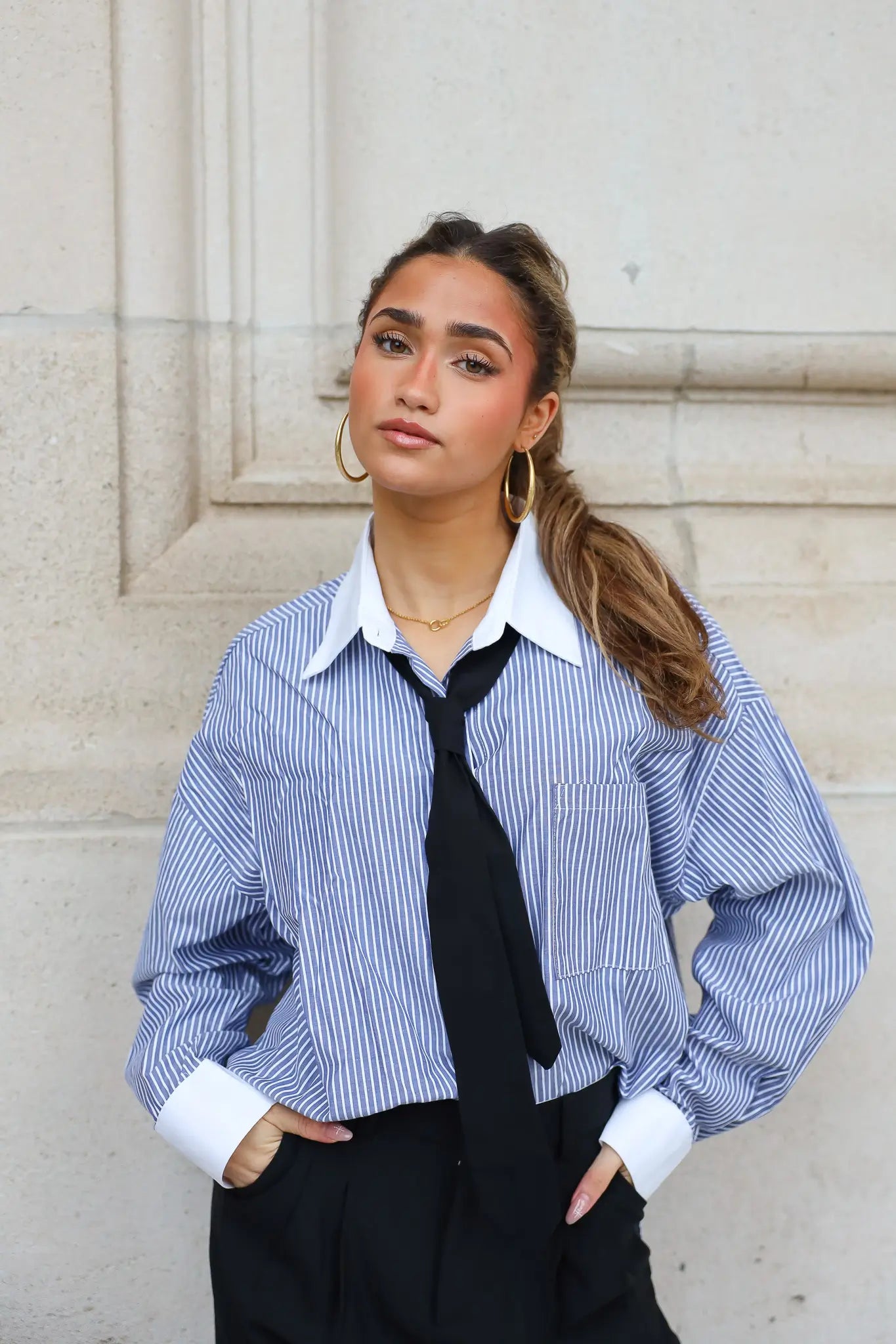 Wat deze gestreepte blouse dames extra interessant maakt, is de losse stropdas. Deze is niet vastgestikt en ook apart verkrijgbaar. Je bepaalt dus zelf hoe je de blouse draagt. Met das en pantalon voor een sterke look, of zonder das op een jeans voor een meer casual combinatie. Ook leuk: combineer ‘m met loafers of hakken, afhankelijk van je plannen.