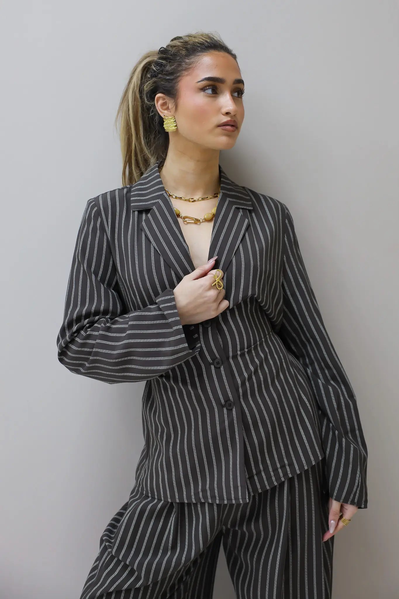 Deze blazer is onderdeel van dezelfde set als de pantalon gestreept bruin. Samen vormen ze een compleet geheel dat je in één keer aankleedt. Ideaal als je niet lang wilt nadenken, maar wel een sterke outfit wilt dragen.