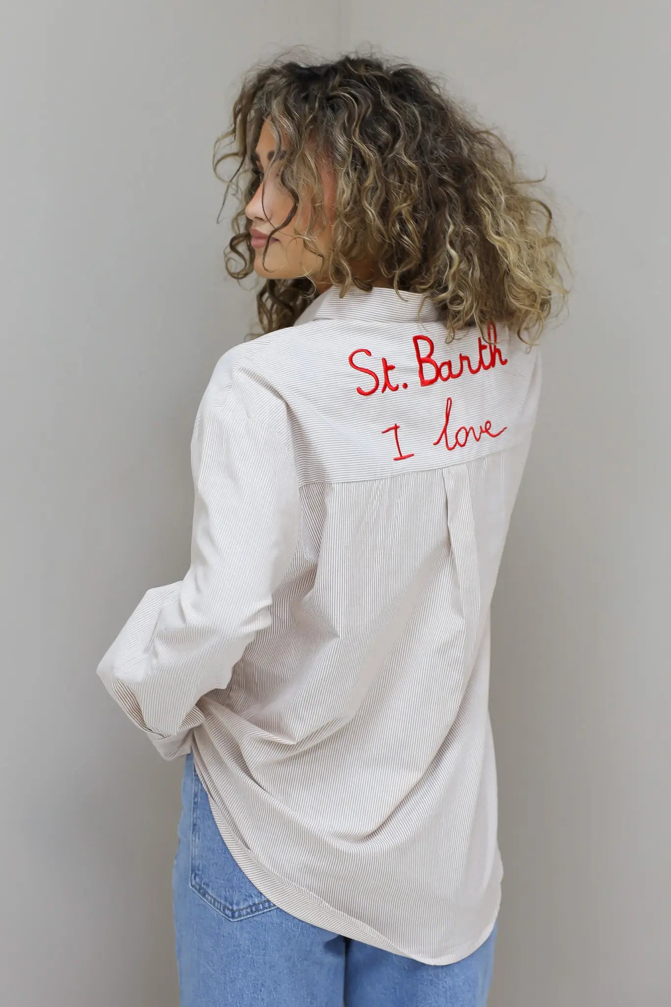 De St. Barth blouse gestreept beige doet het goed bij verschillende combinaties. Draag ’m los over een broek voor een relaxte look, of half ingestopt voor een netter effect. Door de lichte kleur kun je makkelijk spelen met contrast in je outfit.