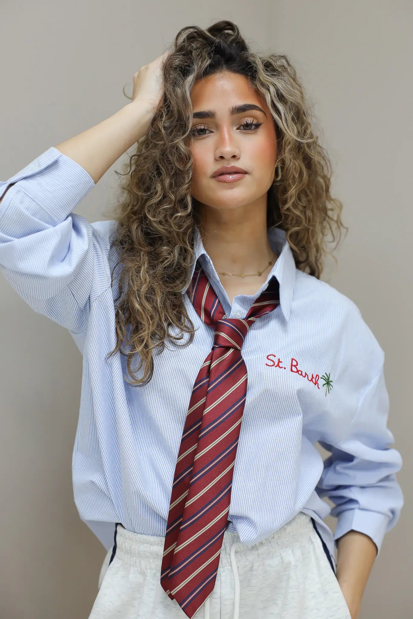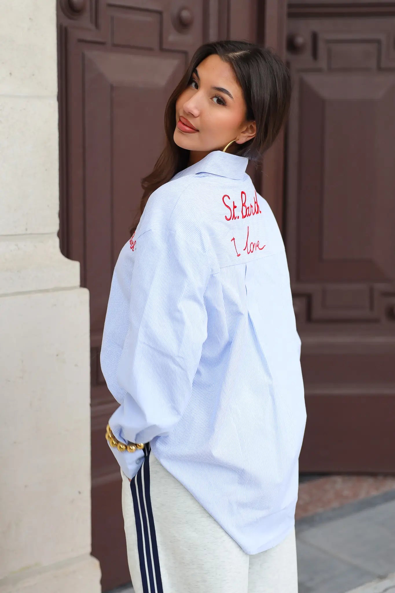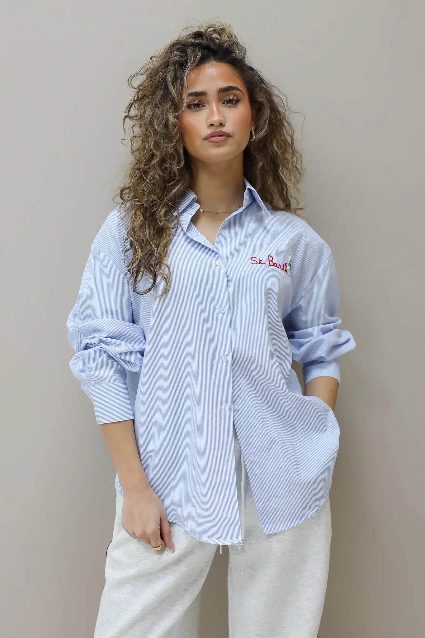 De blauwe St. Barth blouse heeft een rechte pasvorm met lange mouwen en een klassieke kraag. De knoopsluiting aan de voorkant maakt het easy om de blouse open of gesloten te dragen. De blauwe strepen geven structuur aan het geheel, terwijl het rode St. Barth borduurtje op borst en rug zorgt voor herkenning en contrast.
