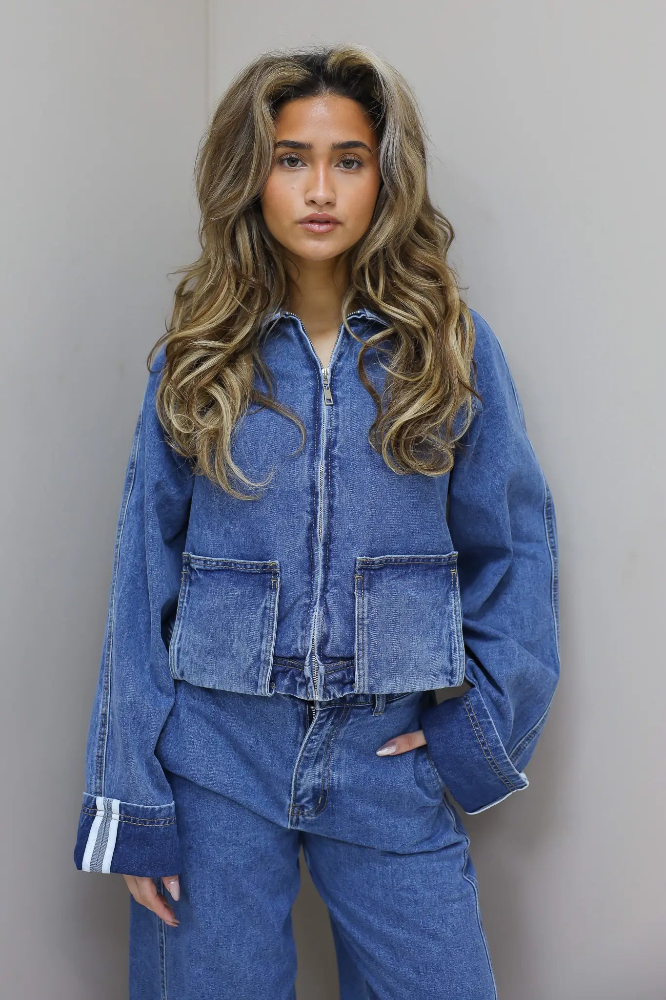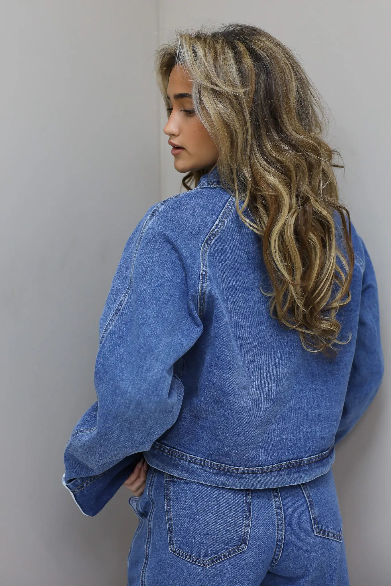 De Spijkerjas Omslag Detail Blauw is zo’n item dat meteen de aandacht trekt wanneer je hem aantrekt. De jas heeft een cropped model met opvallende omslagdetails aan de mouwen en zakken aan de voorkant. Daardoor krijgt de jas een herkenbare uitstraling die net even anders oogt dan een standaard spijkerjas.