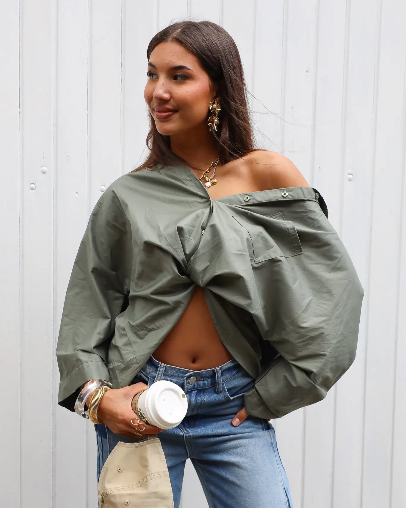 Losvallende groene blouse die je outfit net wat stoerder maakt