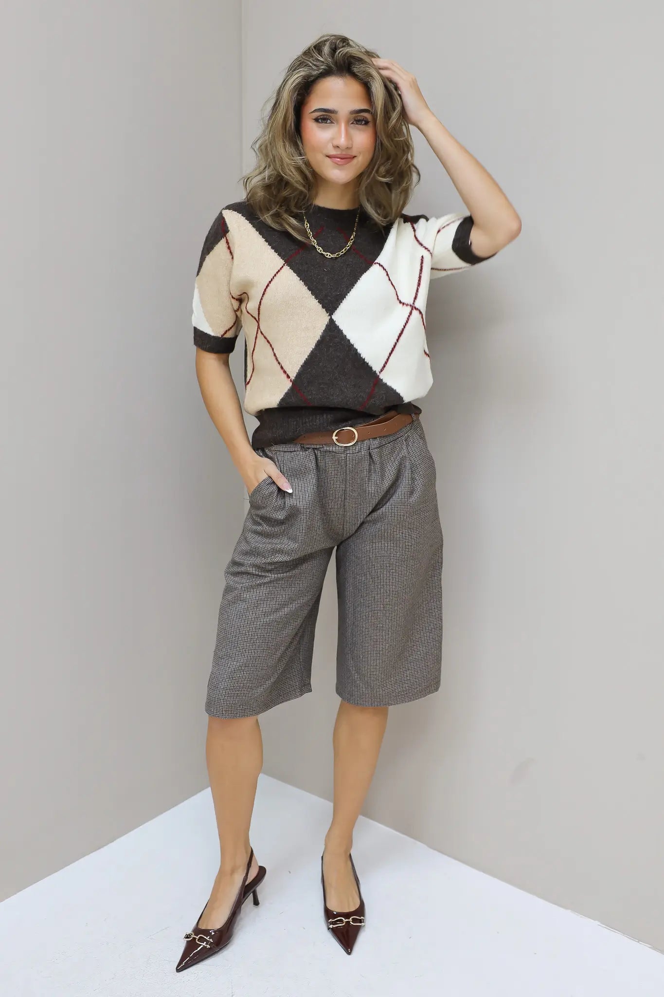 Trui korte mouwen ruit bruin: warme tint met een trendy print
