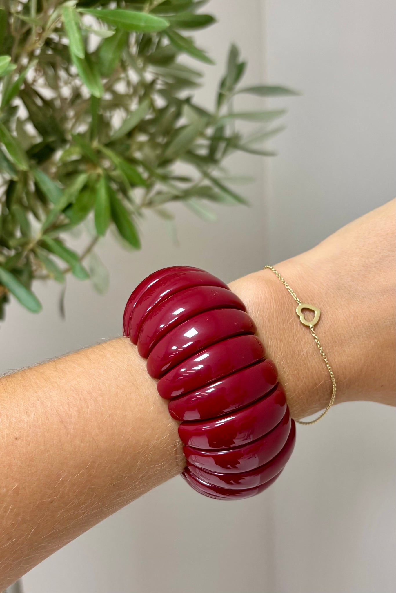 Deze stevige armband in diep bordeaux geeft je look extra kracht. Draag ‘m los of met meerdere armbanden. Licht, opvallend en makkelijk te combineren.