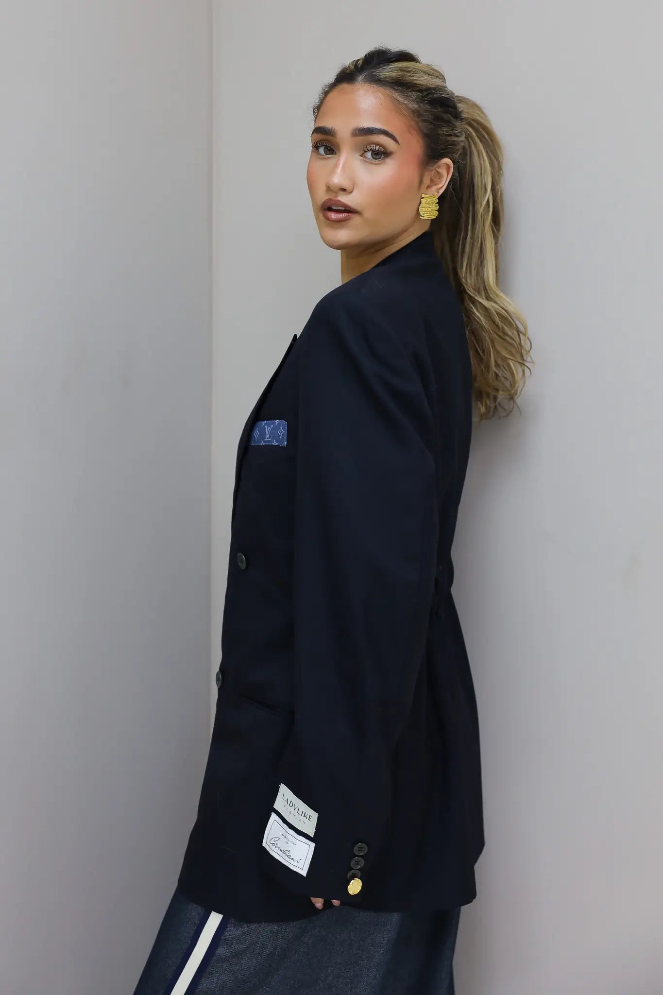 De stof voelt rijk aan, de structuur is stevig en de snit zorgt voor een mooie rechte lijn. Je merkt dat dit geen doorsnee blazer is, maar een item met geschiedenis.