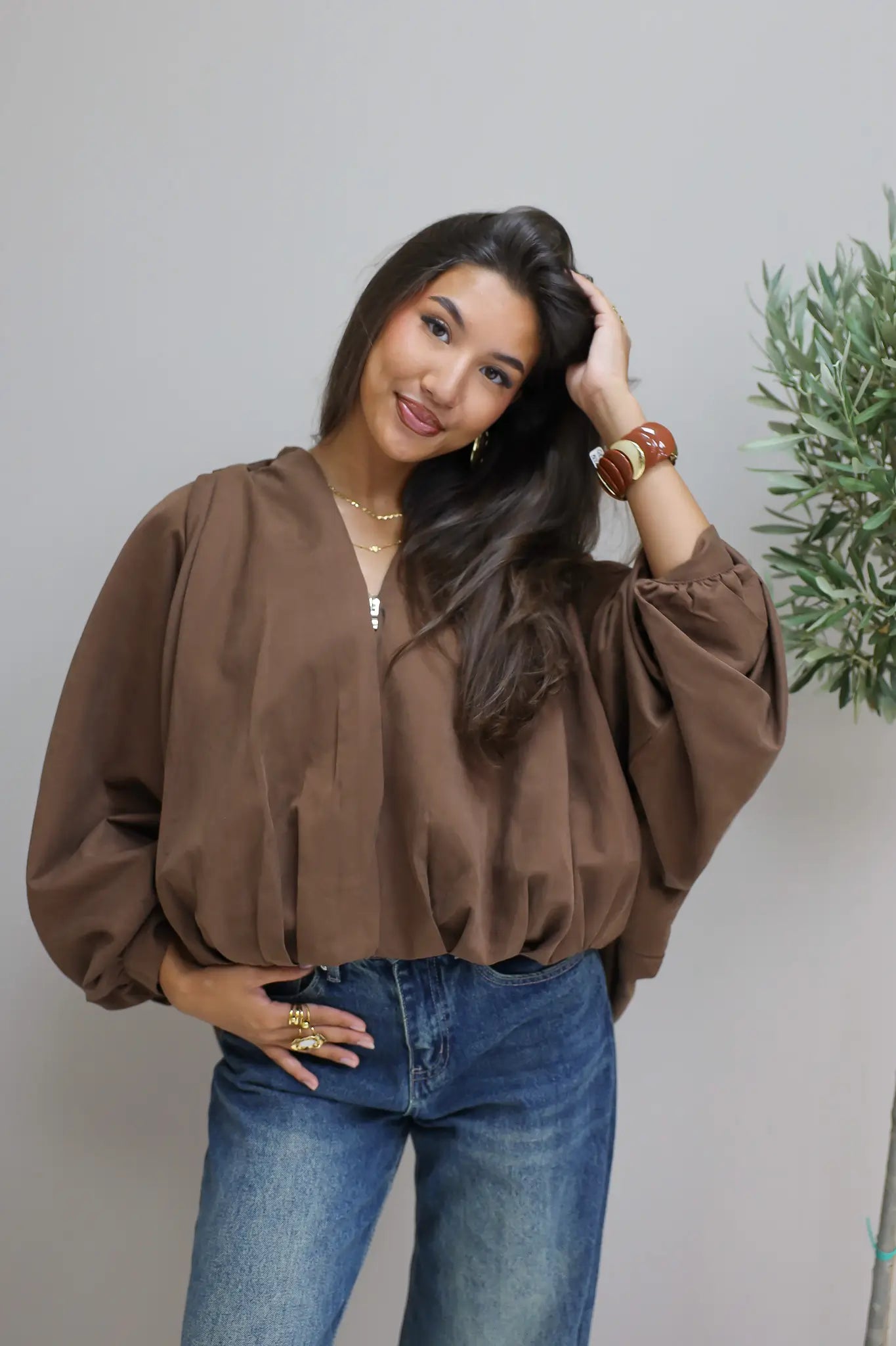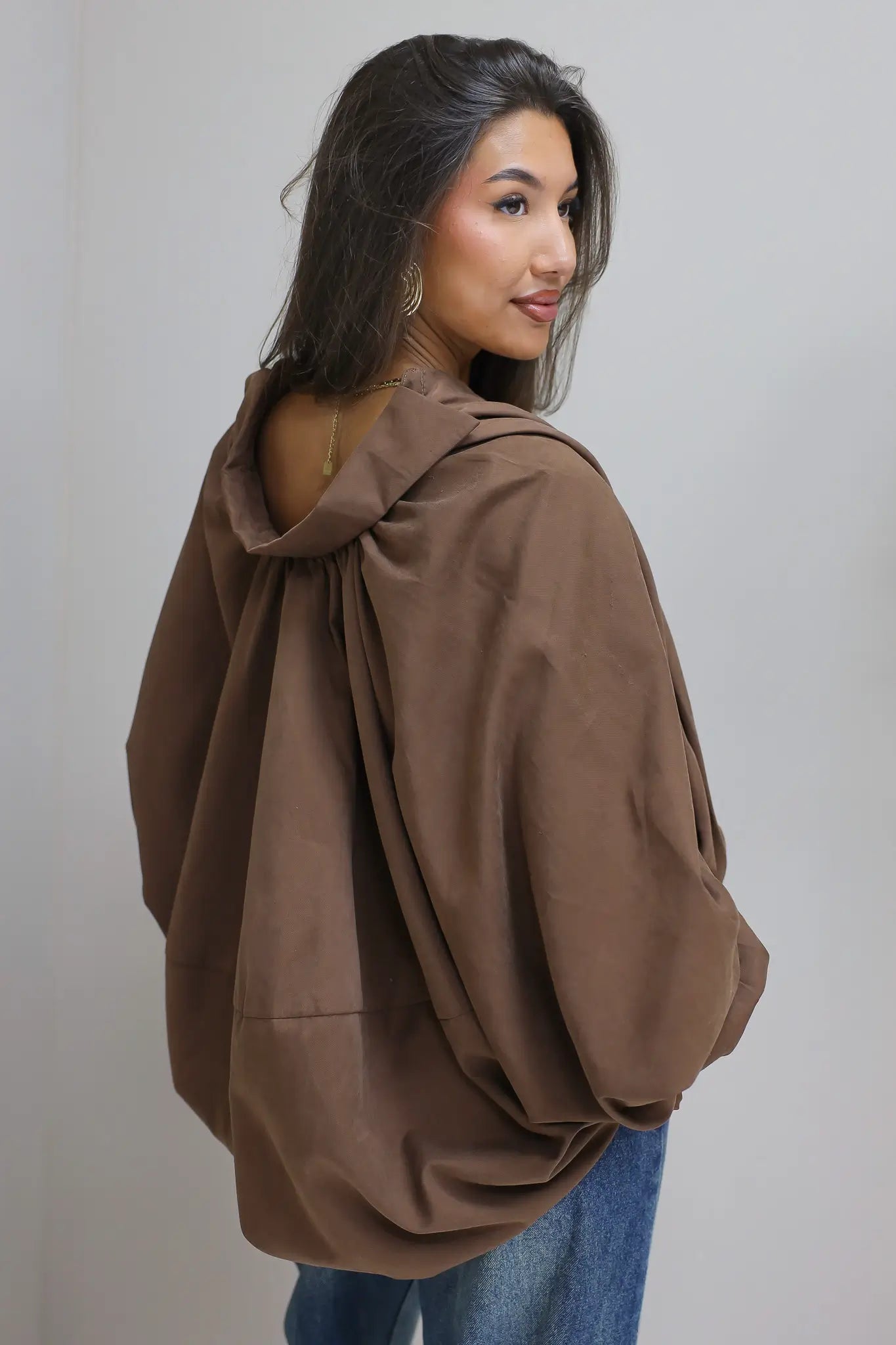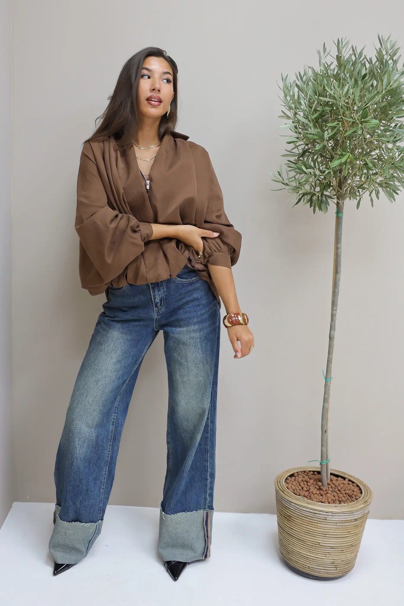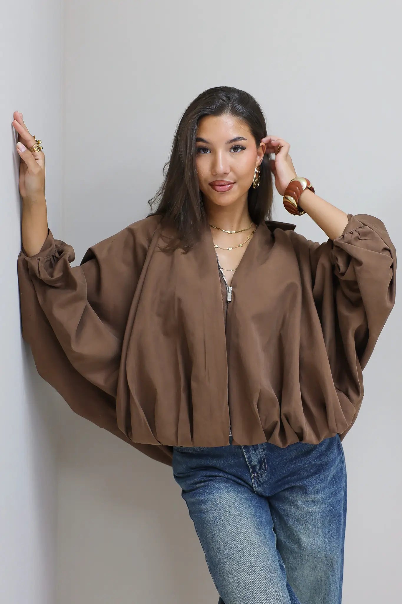 Oversized jassen zijn al een tijdje een favoriet in de modewereld, en dit ballon jasje in bruin laat zien waarom. Het combineert een trendy pasvorm met het gemak van een lichte jas die je snel aantrekt. De kleur bruin maakt het extra veelzijdig: het staat prachtig bij jeans, pantalons of een rok en past zowel bij neutrale tinten als bij felle kleuren.