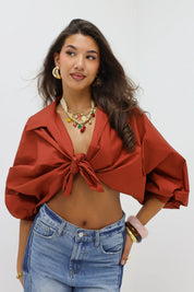 De kleur bruin is helemaal terug. De iets wijde mouwen met knoop aan de onderkant geven ‘m net wat meer vorm, terwijl de blouse zelf lekker los valt en aan de voorkant geknoopt wordt. Daardoor draag je ‘m op je eigen manier: over een jeans, op een short, of met een hoge broek erin geknoopt.