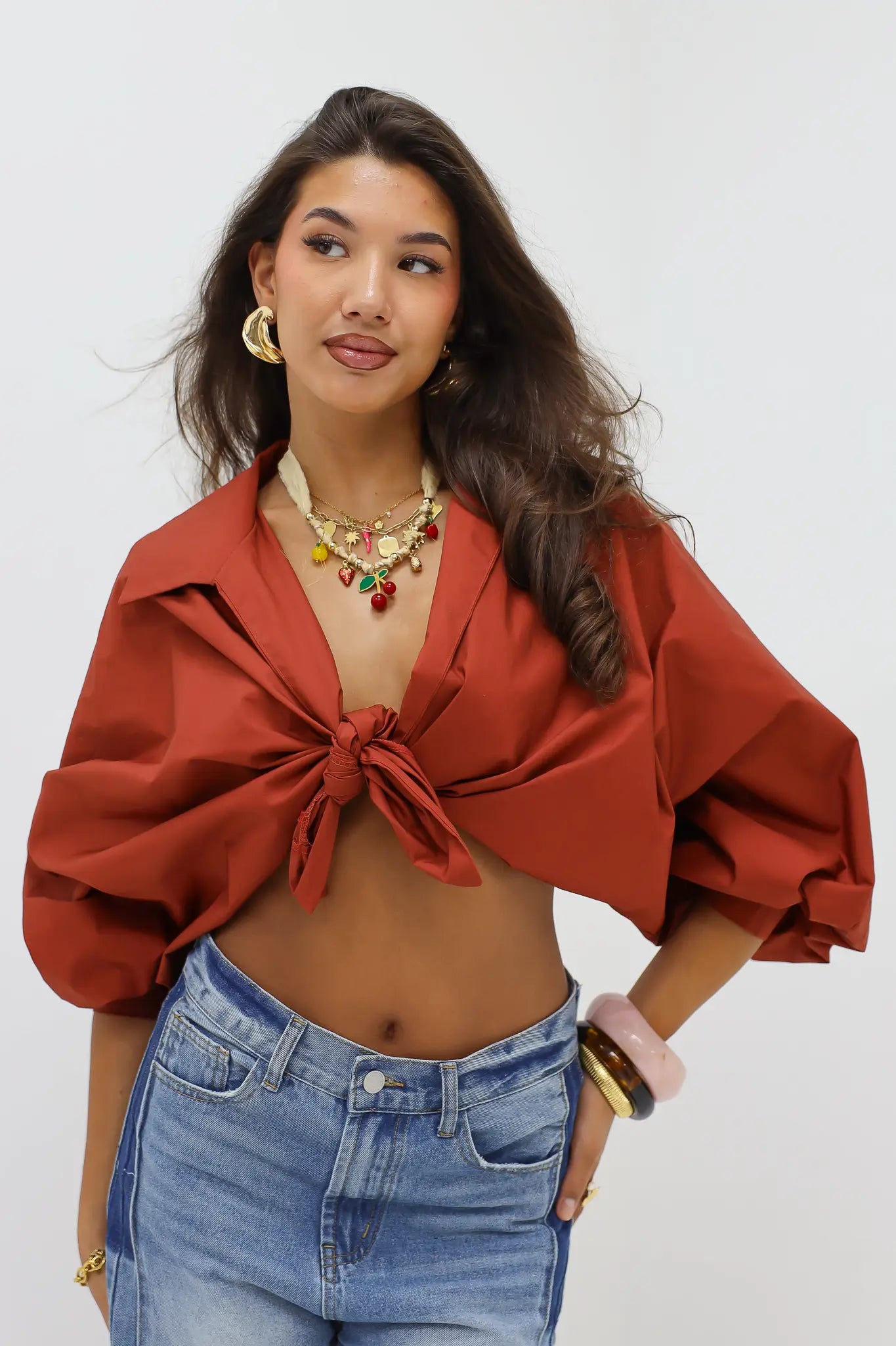Een blouse die niet standaard is, maar wel makkelijk te combineren én direct iets doet met je outfit? Deze bruine knoop blouse is precies dat. Door de luchtige pasvorm, de diepe kleur en de nonchalante knoop van voren is dit het soort item dat je erbij pakt als je snel iets aan wilt dat net iets meer uitstraalt dan een basic shirt.