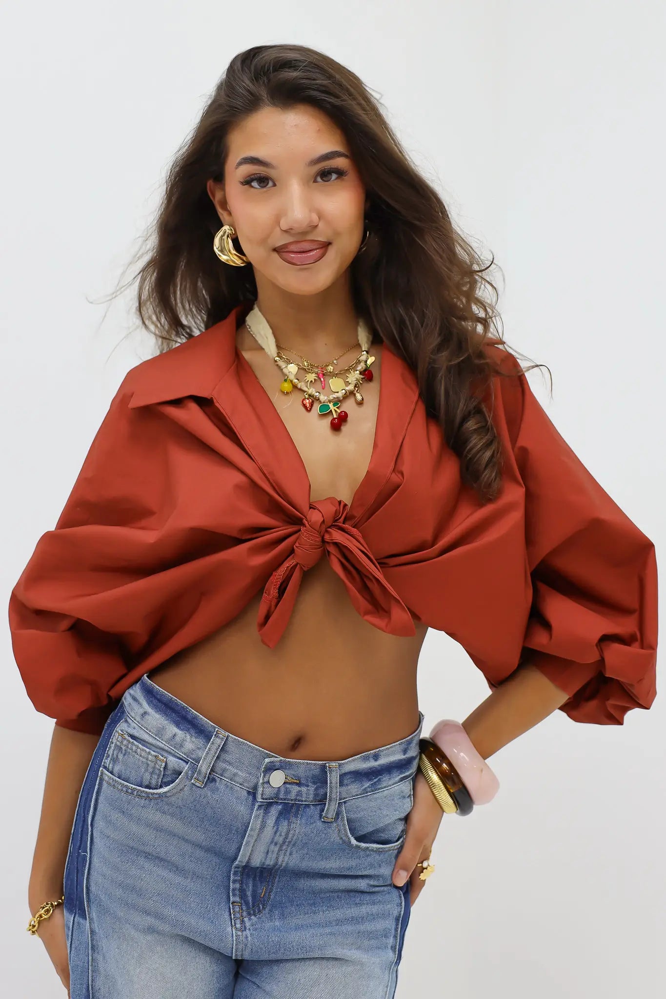 Knoop blouse dames bruin fris, nonchalant en makkelijk te combineren