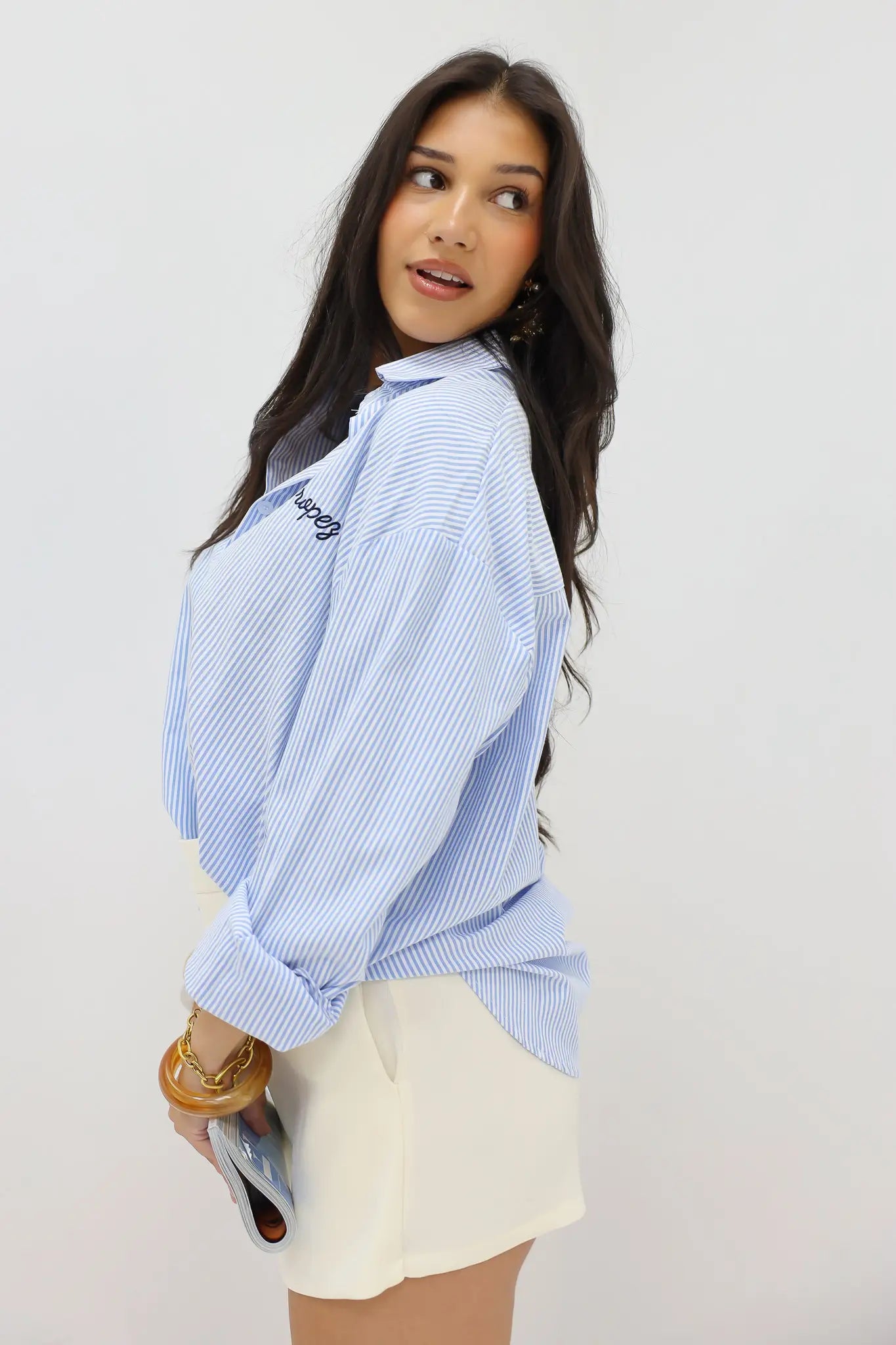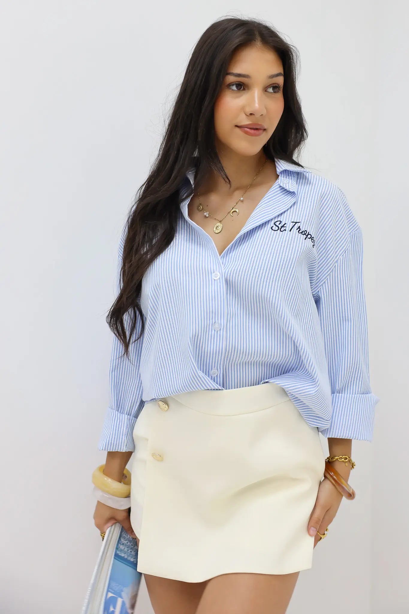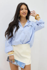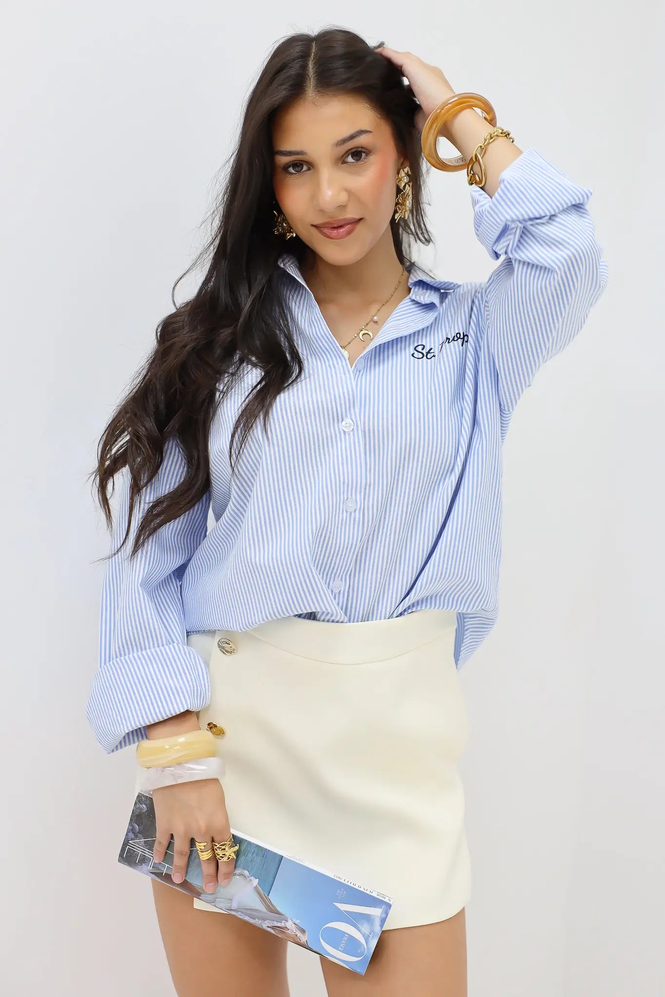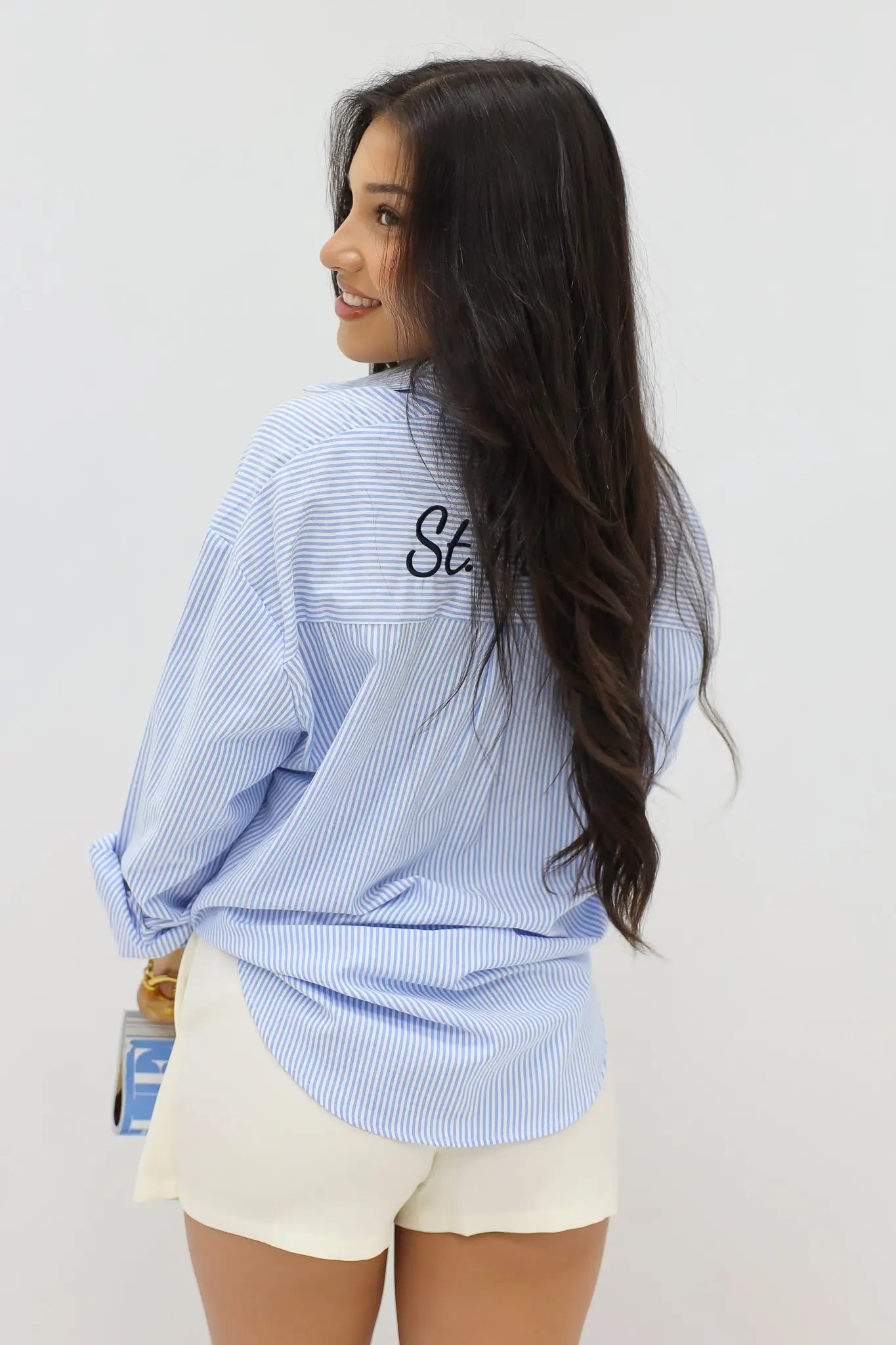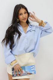 De klassieke kraag, knoopsluiting en licht oversized fit geven deze blouse een relaxte vibe. Maar het echte verschil zit in de details: het fijne streepdessin, de zwarte borduring en de iets langere achterkant zorgen ervoor dat dit item opvalt zonder schreeuwerig te zijn.