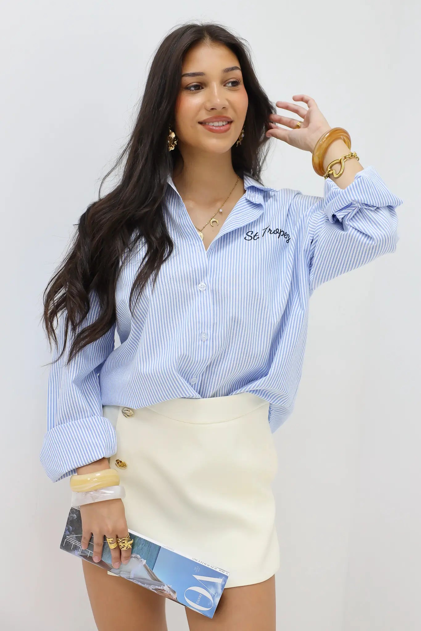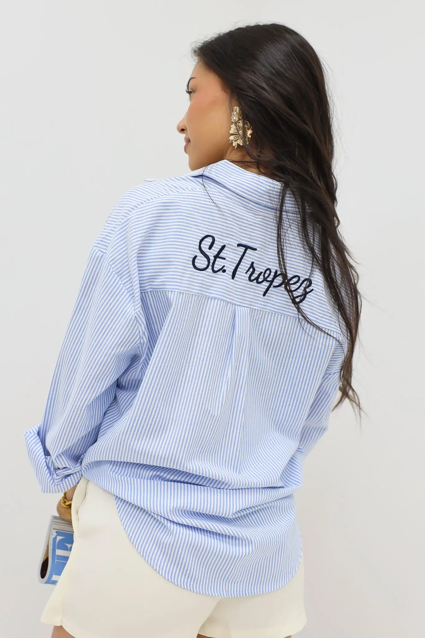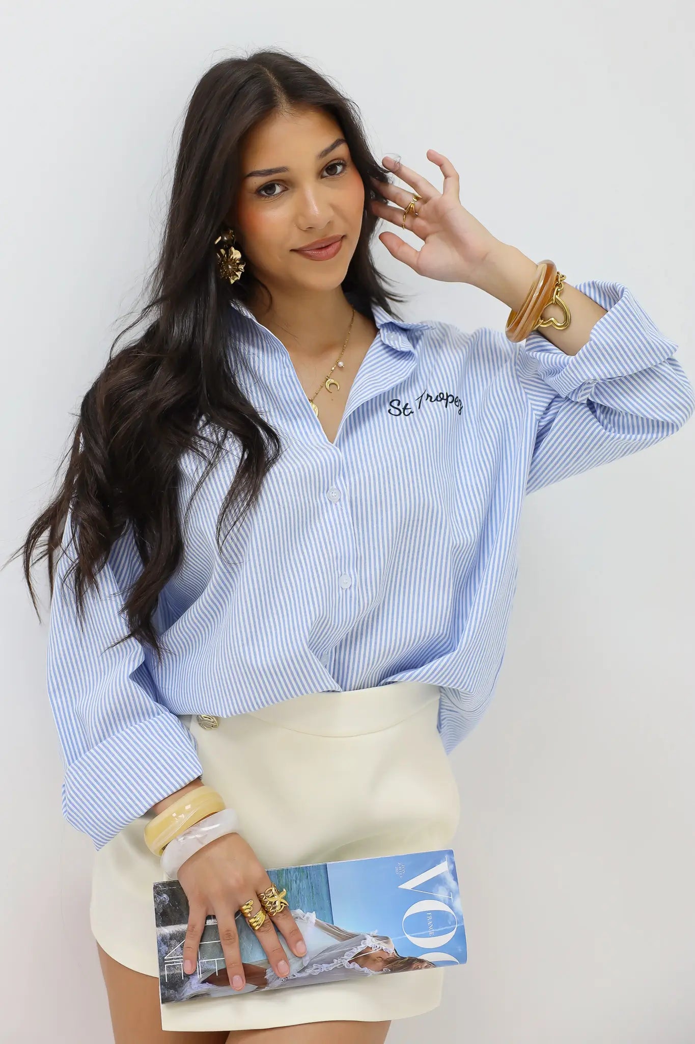Laat je verrassen door deze blauw-wit gestreepte blouse met geborduurde 'St. Tropez'-tekst op de borst en rug. Een item dat direct doet denken aan zonnige dagen, slippers aan je voeten en een relaxte sfeer. Deze blouse is niet alleen ideaal voor je zomerdagen, maar hangt ook gewoon in onze winkel in Middelburg.