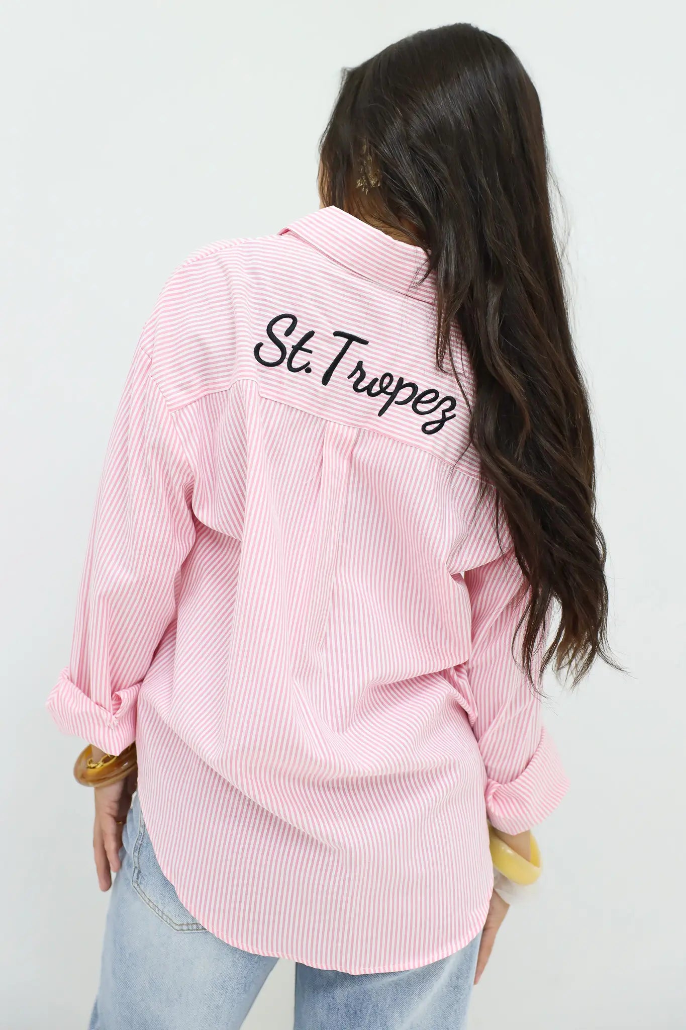 Zoek je een blouse die net even wat anders doet, maar wel makkelijk combineert? Dan zit je met deze roze streepjesblouse met St. Tropez-borduring goed. De losse fit en katoenmix stof maken 'm perfect voor zonnige dagen of gewoon als luchtige laag. Of je 'm nu los draagt met een short of combineert met een jeans of pantalon: deze blouse past zich makkelijk aan jouw dag aan. Ook verkrijgbaar in onze winkel in Middelburg.