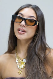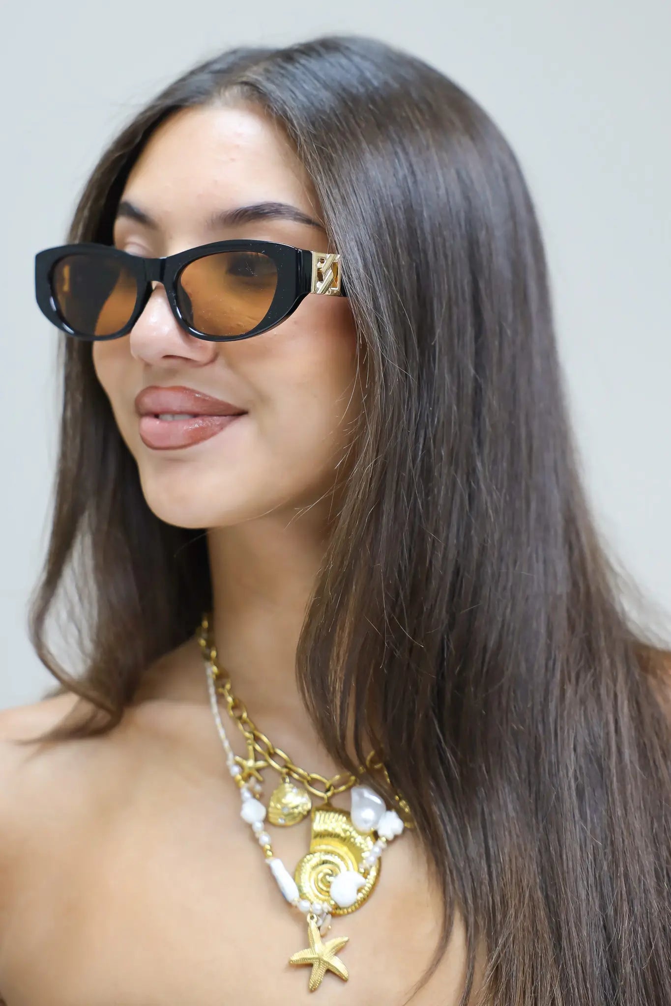 De Nikki zonnebril in zwart is anders dan je gewend bent, maar juist daardoor verrassend makkelijk te combineren. De oranje glazen geven nét dat beetje tint, zonder te donker te zijn. Perfect voor zonnige dagen waarbij je je ogen wil beschermen, maar toch je gezicht zichtbaar blijft. Denk aan een zomerdag op een terras, een brunch met vriendinnen of een roadtrip met de ramen open.