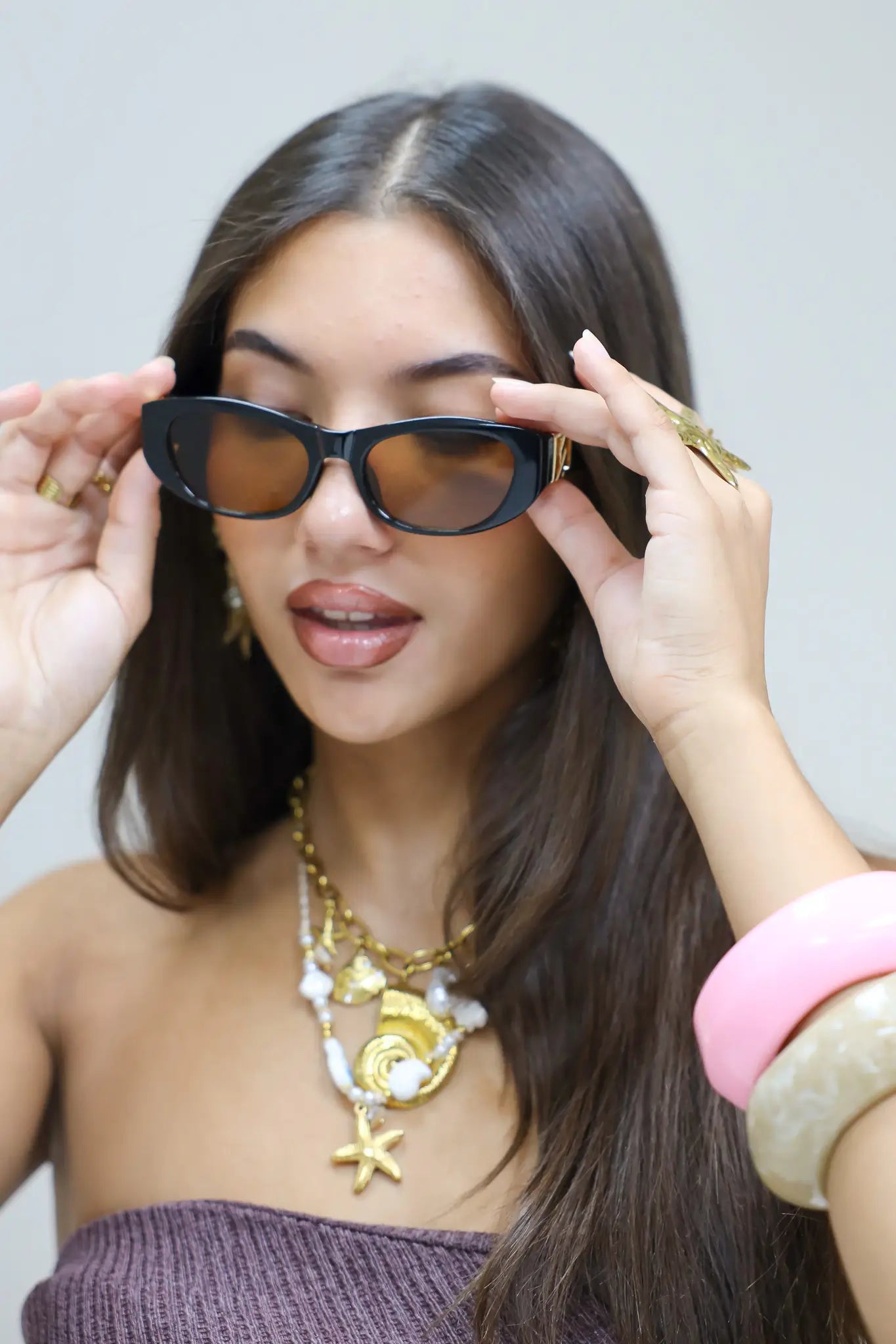 Waar voorheen vooral donkere en oversized brillen populair waren, zie je nu steeds vaker zonnebrillen met een oranje tint of een gekleurd montuur. Denk aan pasteltinten, transparante frames en opvallende vormen. Deze zwarte zonnebril past helemaal in dat plaatje.