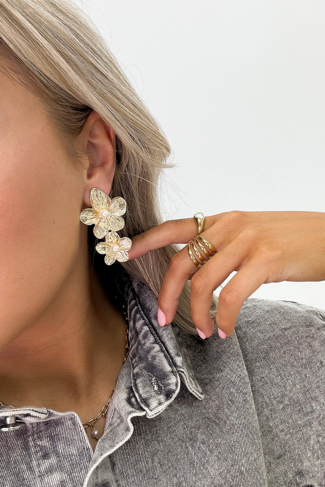 Houd jij van toffe statement oorbellen? Dan is dit gouden paar oorbellen met twee mooie bloemen met structuur echt iets voor jou! De oorbellen zijn perfect te dragen naar een chique feestje en kunnen met oneindig veel leuke sieraden en tassen gecombineerd worden. De oorbellen zijn gemaakt van Alloy en hebben een afmeting van 5,3 cm.