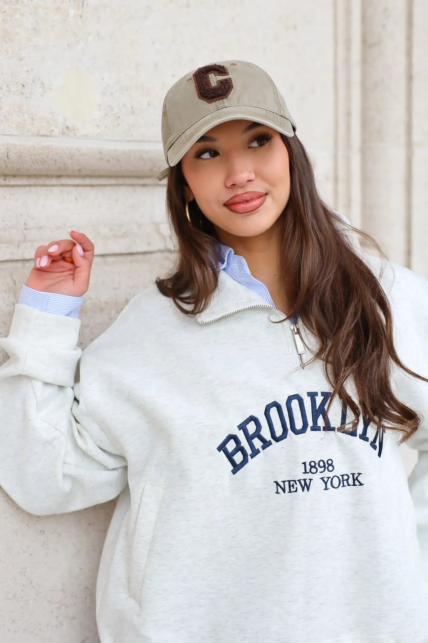 Paris Club Sweater in beige gedragen zittend op straat