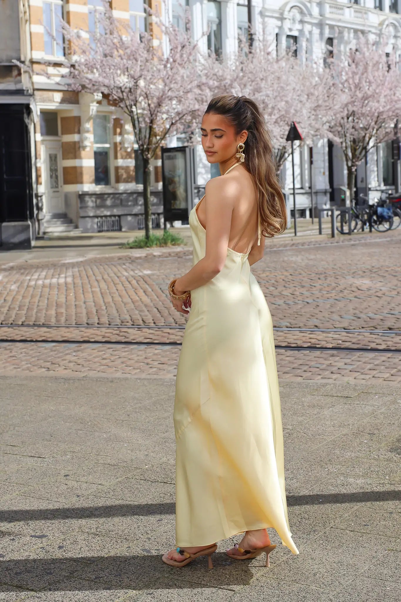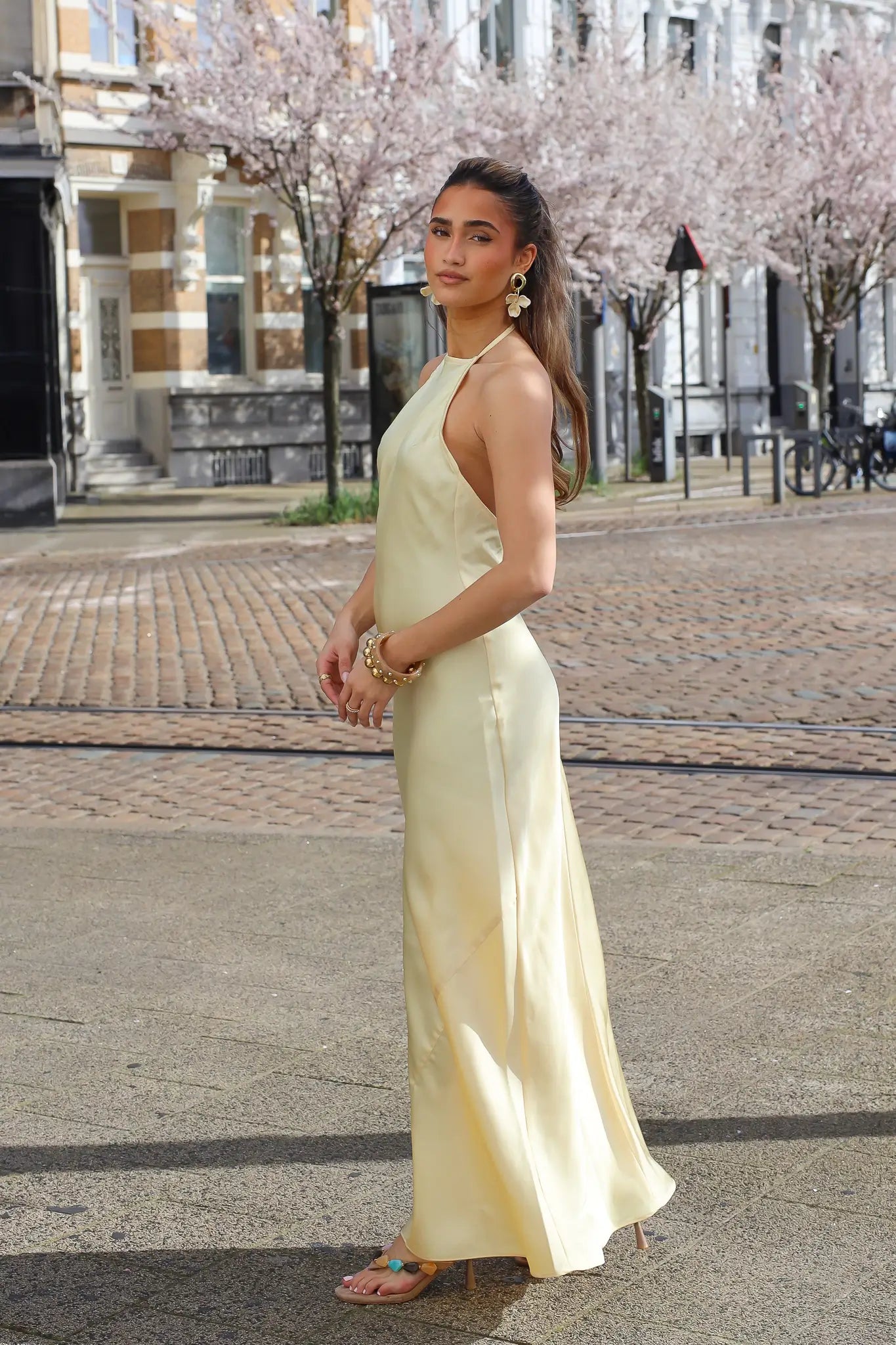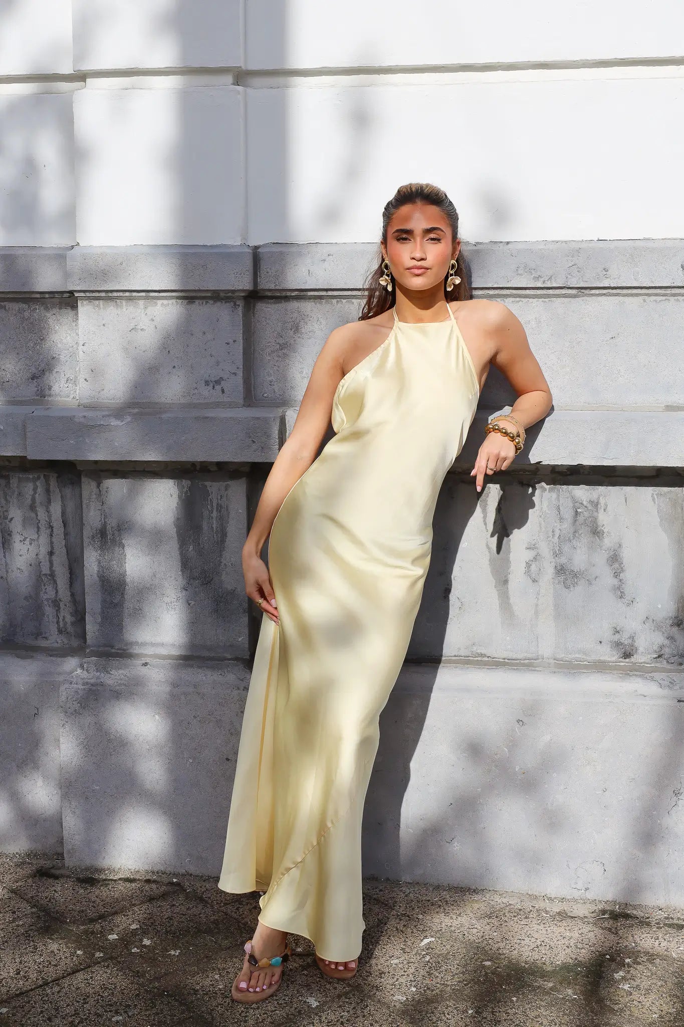 Zo combineer je deze satijnen maxi jurk geel