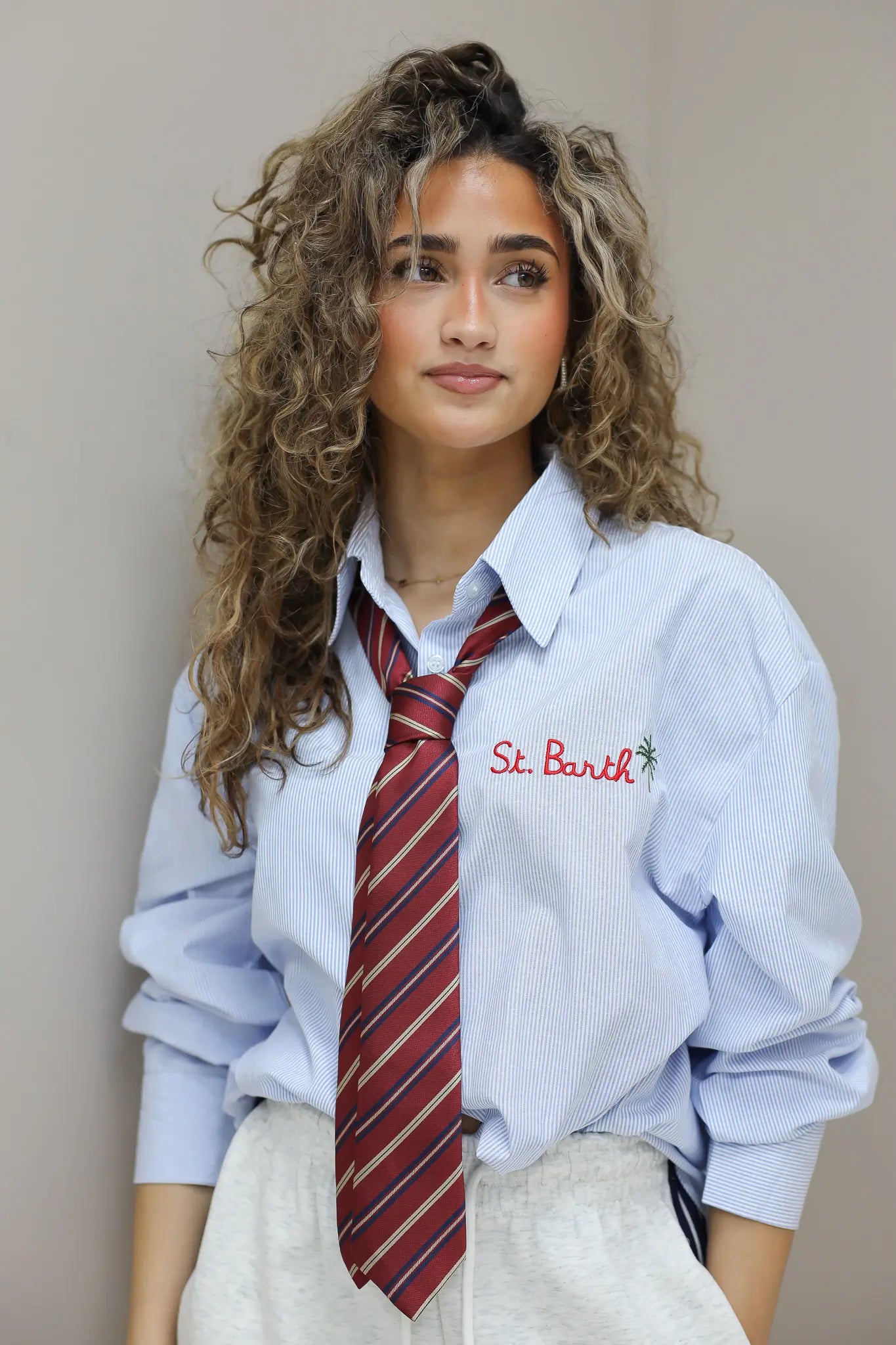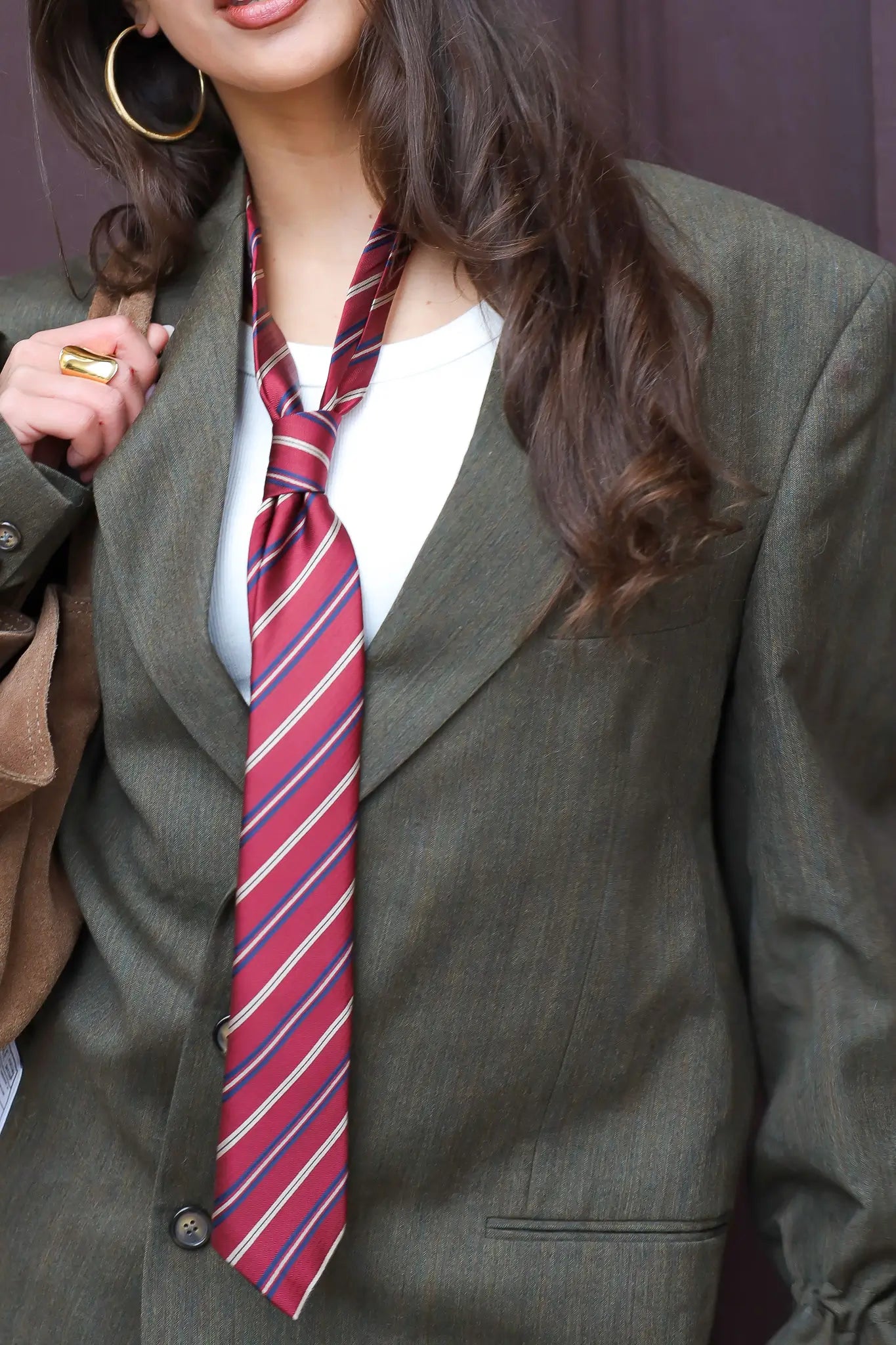 Net als bij andere stropdassen uit de collectie hoef je ’m niet alleen te gebruiken waarvoor hij bedoeld is. Deze rode gestreepte stropdas kun je ook dragen als riem in een jeans. Door ’m door de lussen te halen en los te knopen, geef je je outfit direct een andere uitstraling. Dat werkt goed met een simpele blouse of een basic top en maakt het geheel net even anders.