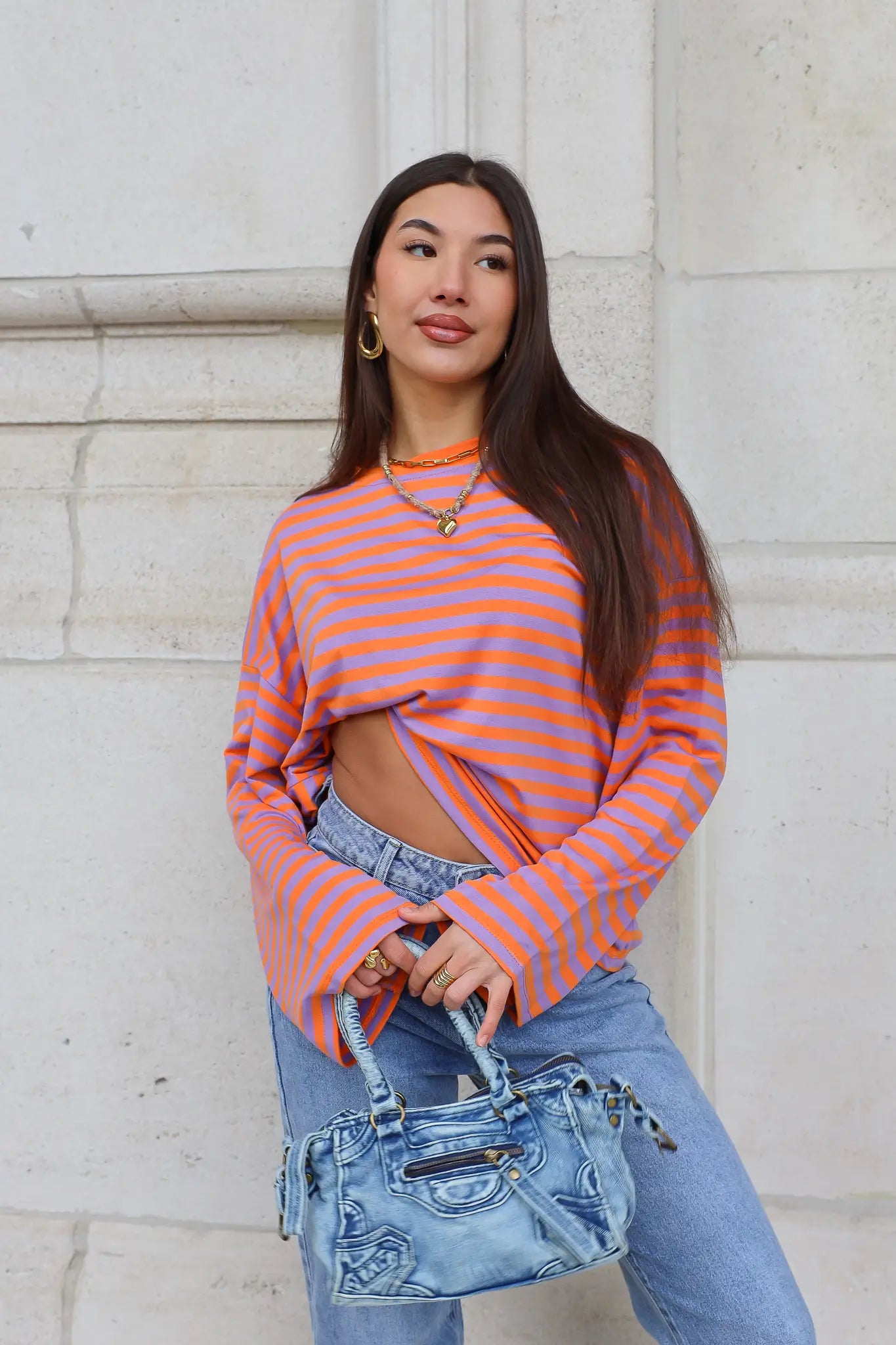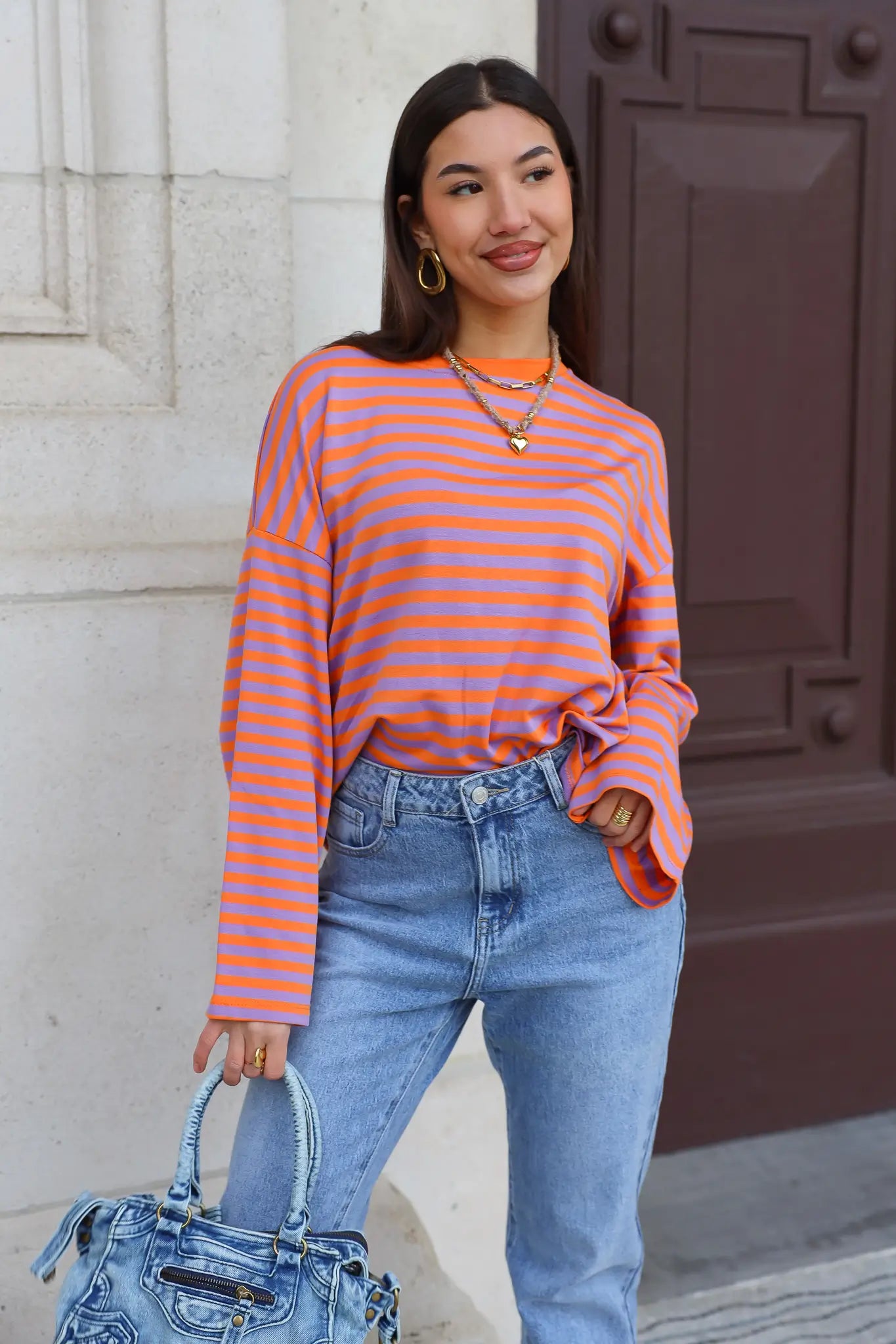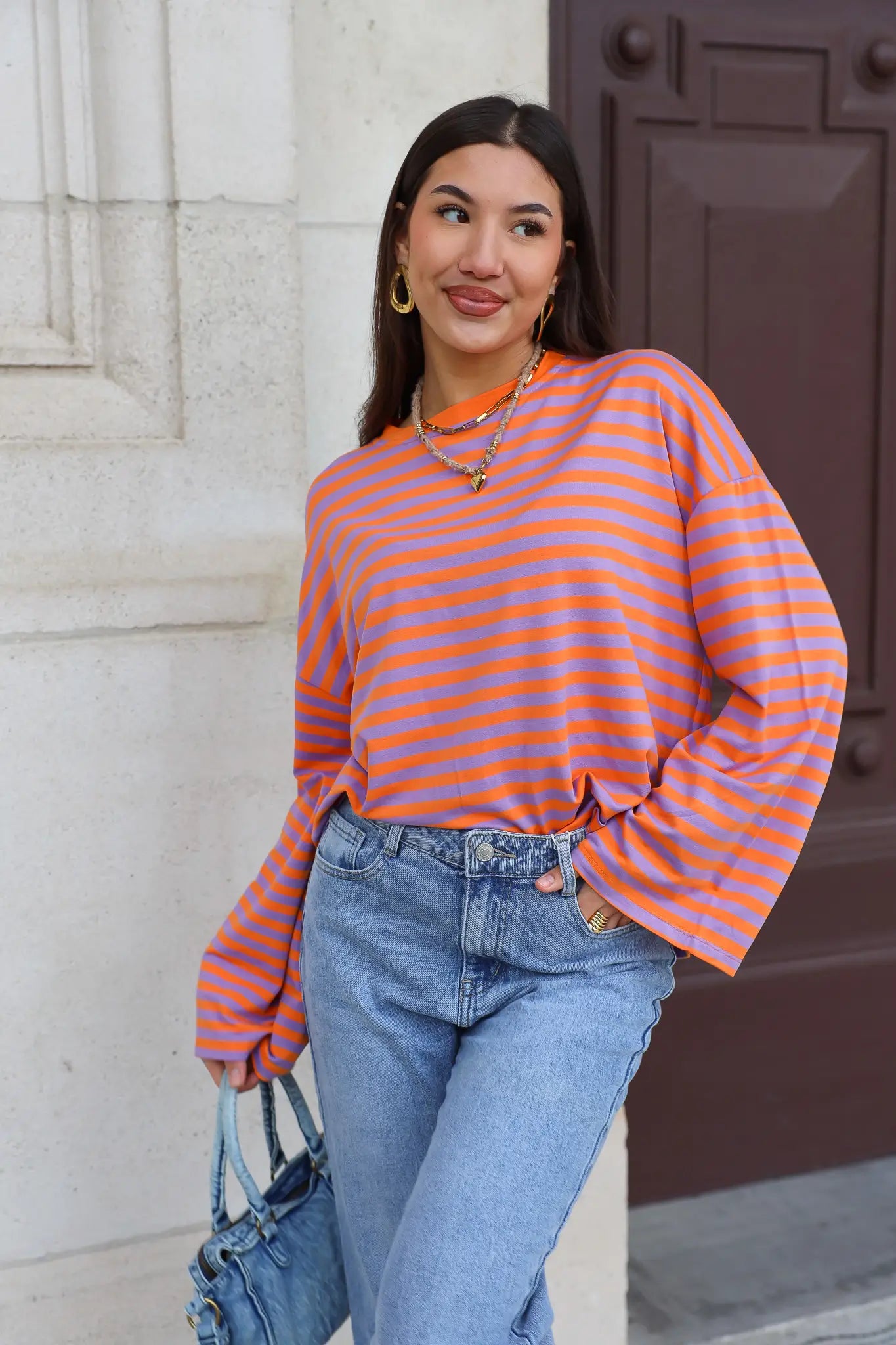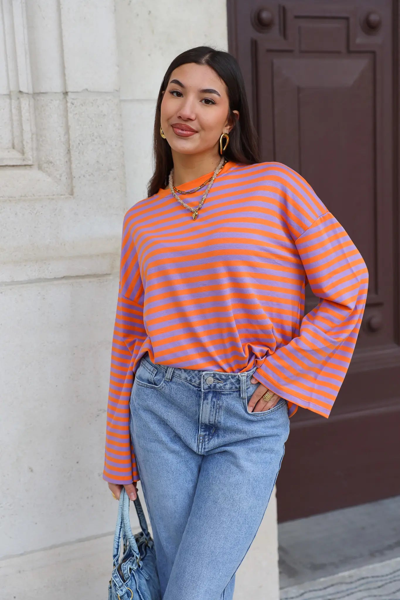 Zo draag je het T-shirt lange mouwen strepen oranje