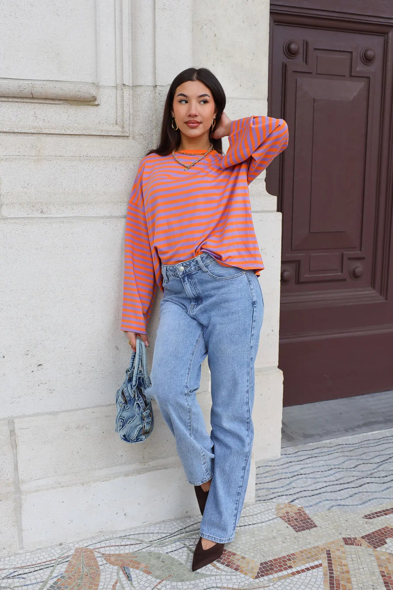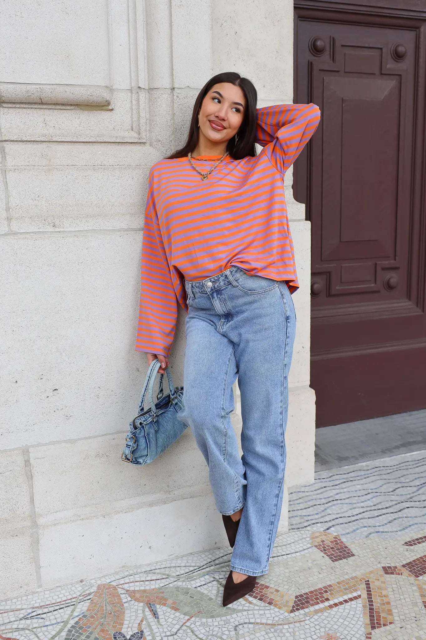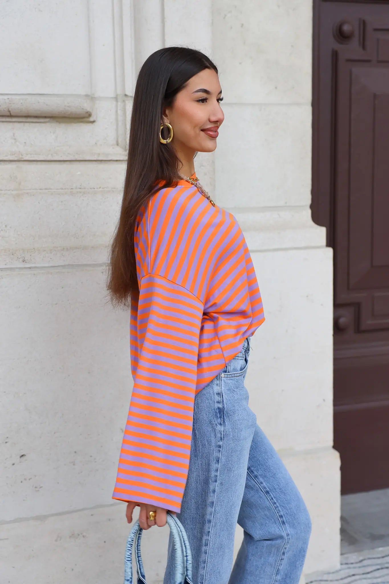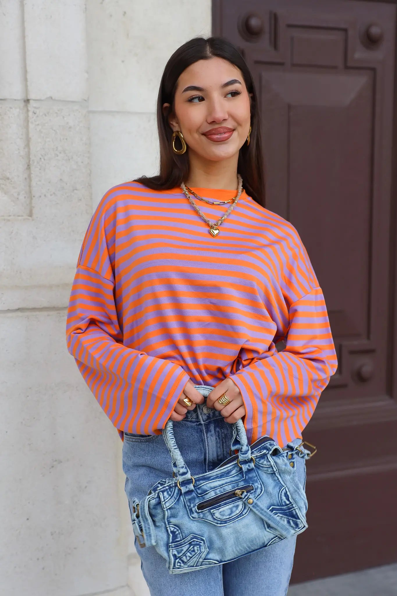 Zo draag je het T-shirt lange mouwen strepen oranje
