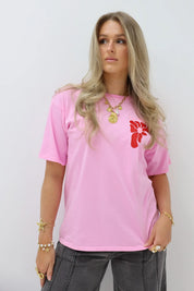 Het model is recht, de pasvorm losjes en de stof voelt licht aan. Daardoor kun je dit shirt makkelijk combineren met een jeans, short of rok. Het roze valt goed op en de opdruk geeft net dat extra detail.
