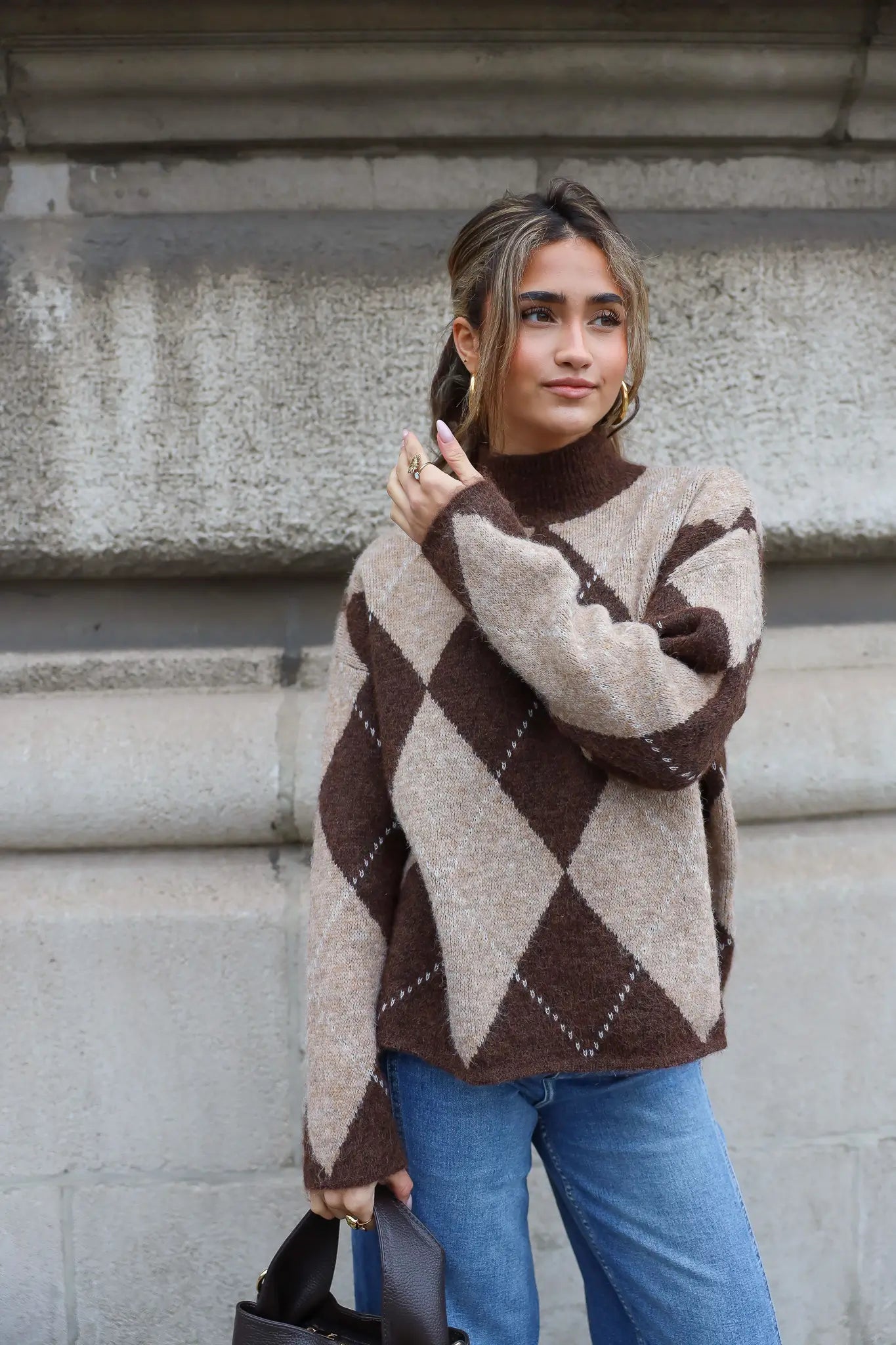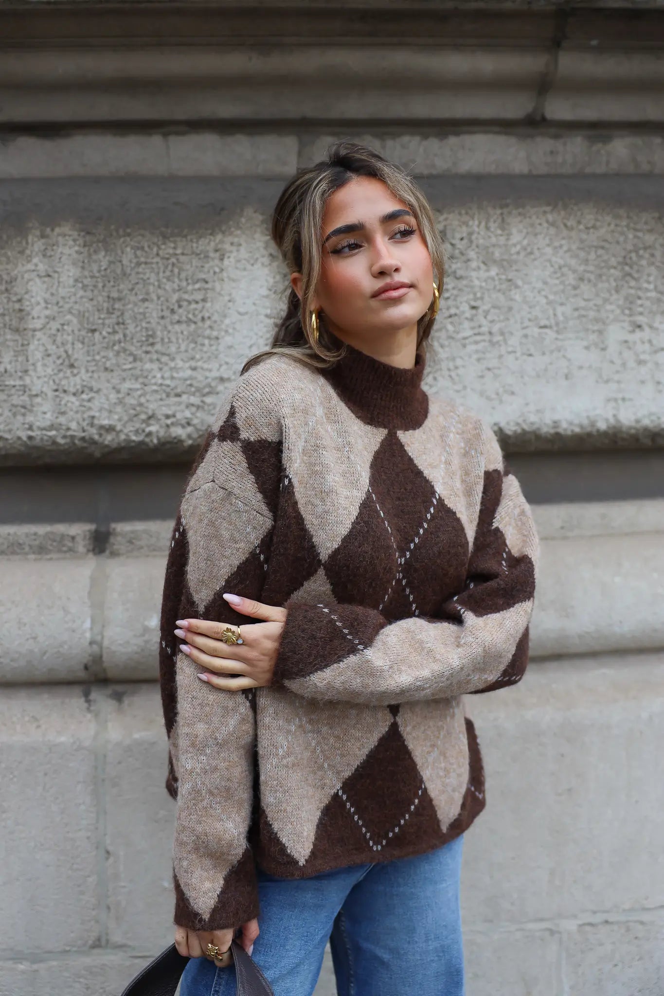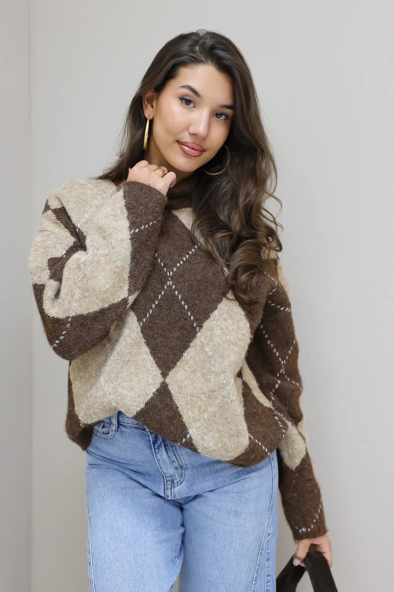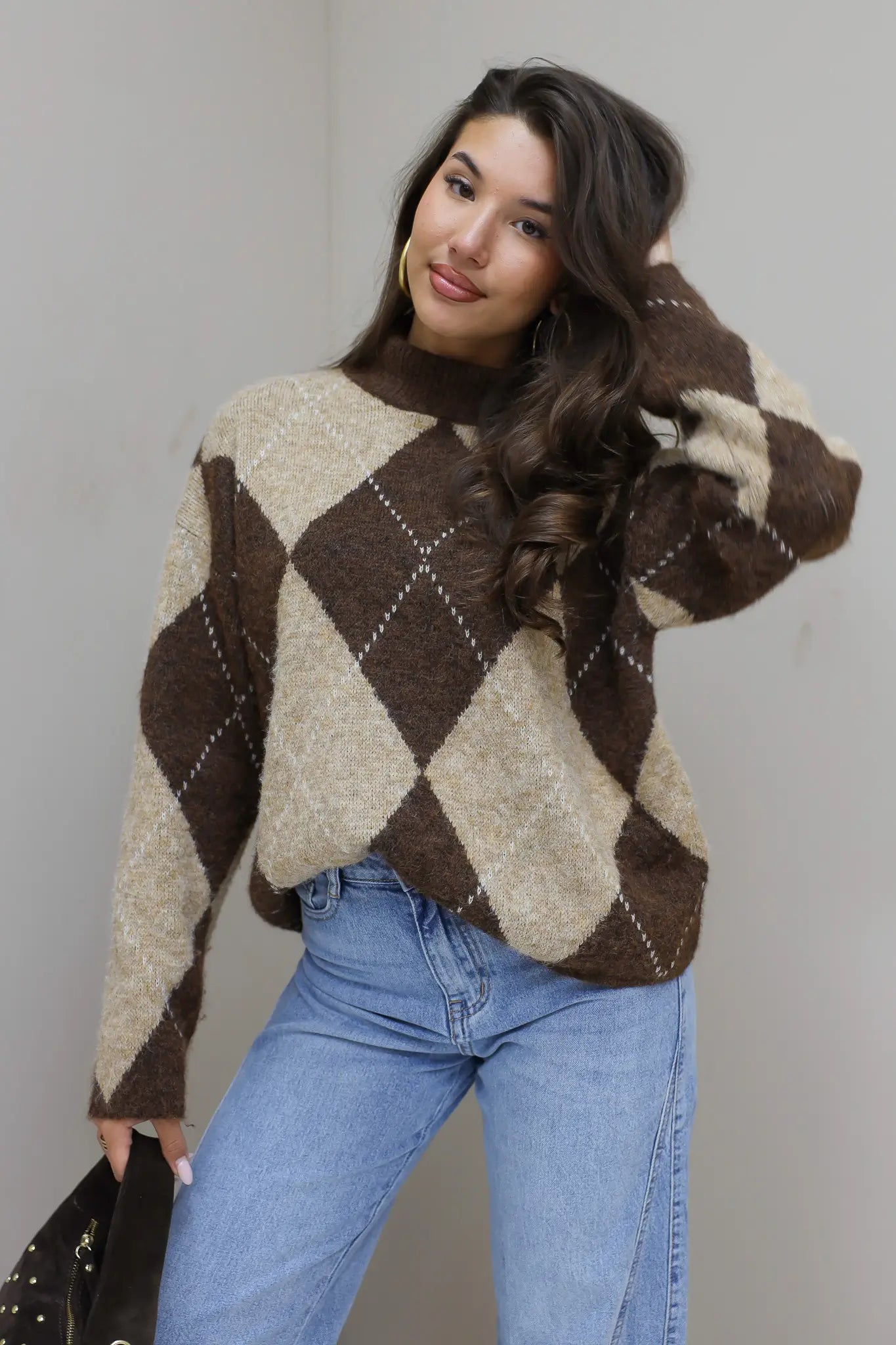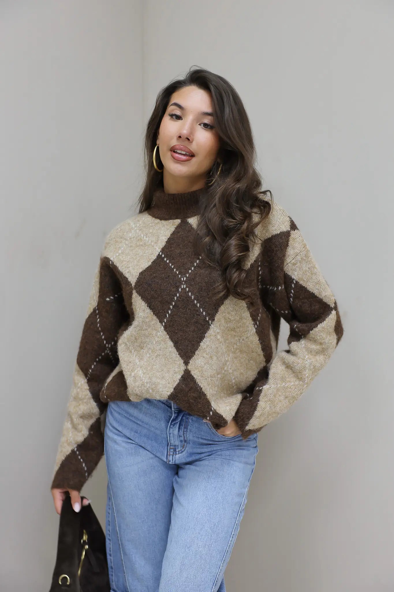 De bruine trui met ruitpatroon is ideaal voor iedereen die houdt van zachte kleuren en knitwear met een beetje pit. De tinten chocoladebruin, beige en taupe zorgen dat je hem eindeloos kunt combineren met andere items uit je kast.