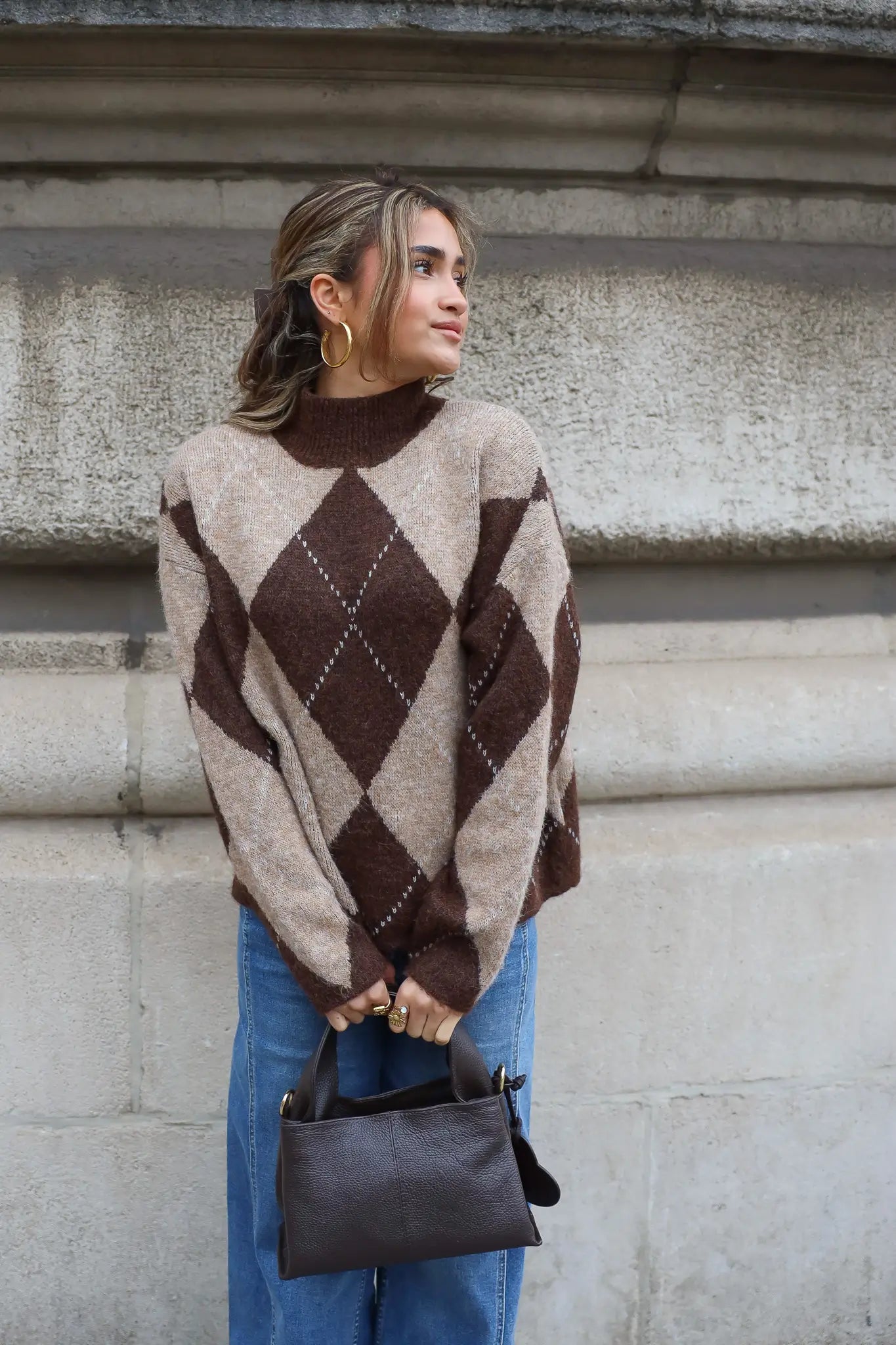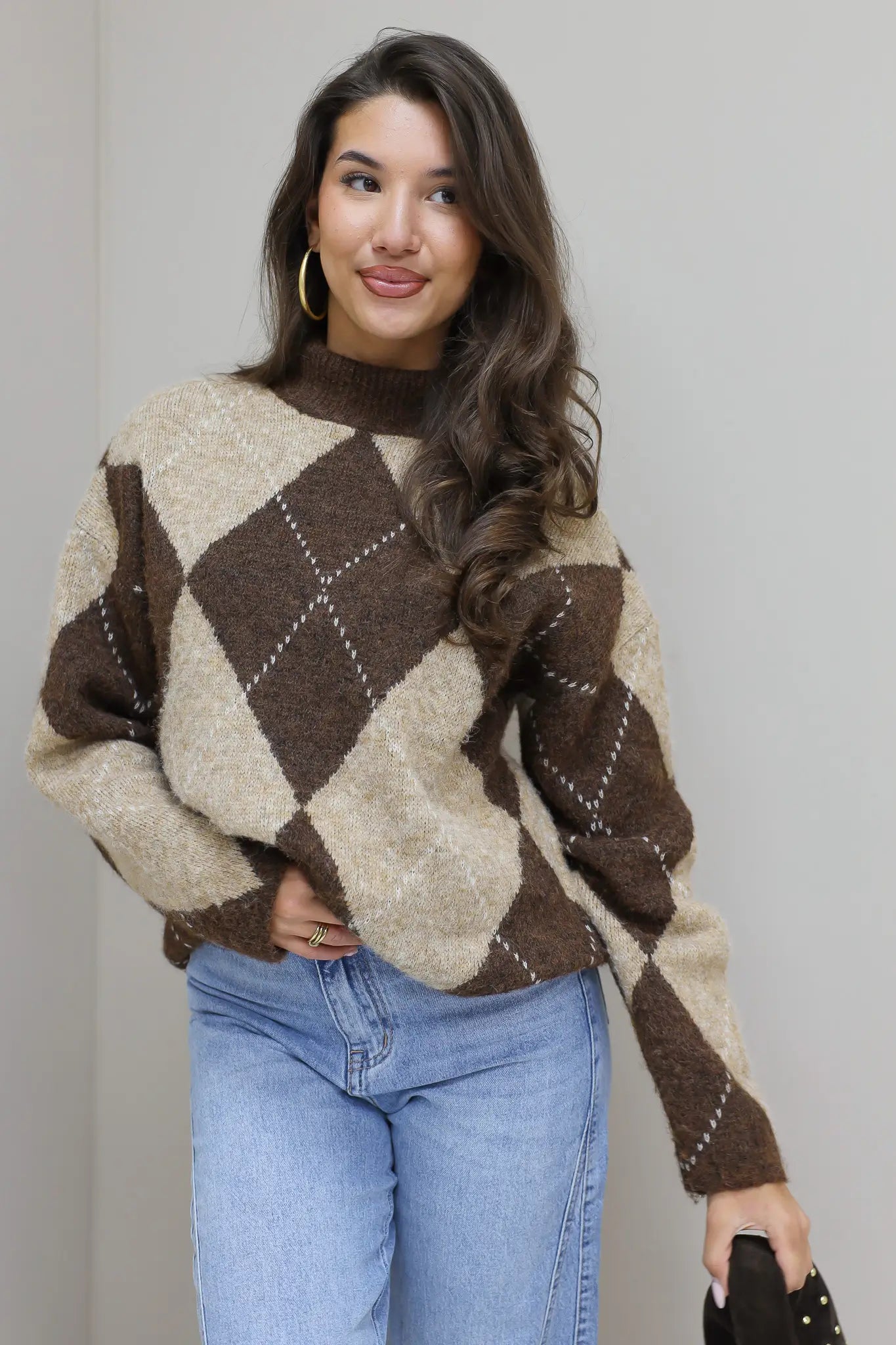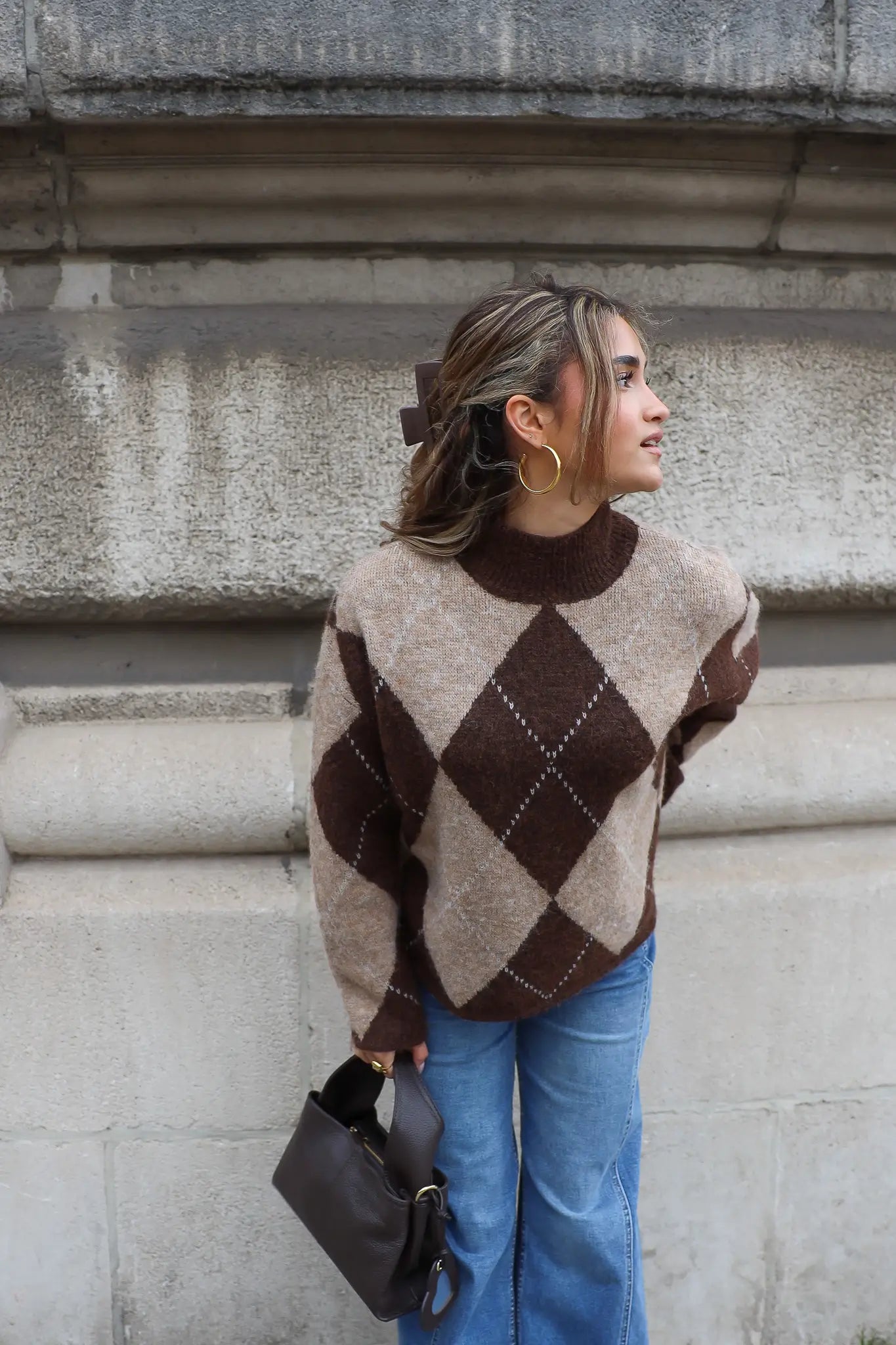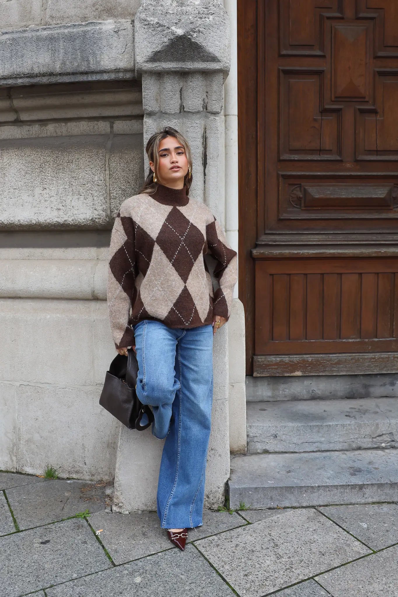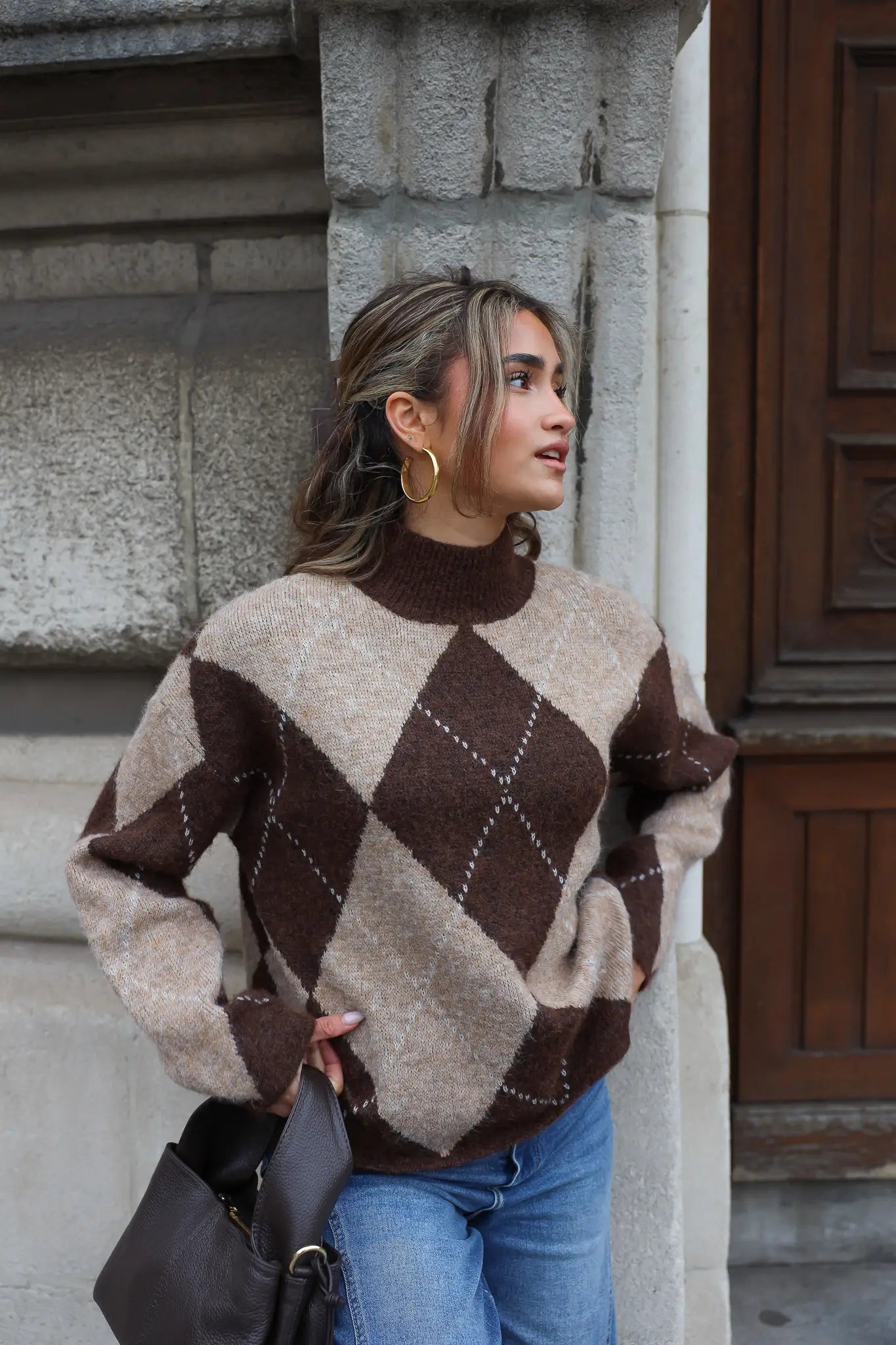 De bruine trui met ruitpatroon is ideaal voor iedereen die houdt van zachte kleuren en knitwear met een beetje pit. De tinten chocoladebruin, beige en taupe zorgen dat je hem eindeloos kunt combineren met andere items uit je kast.