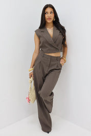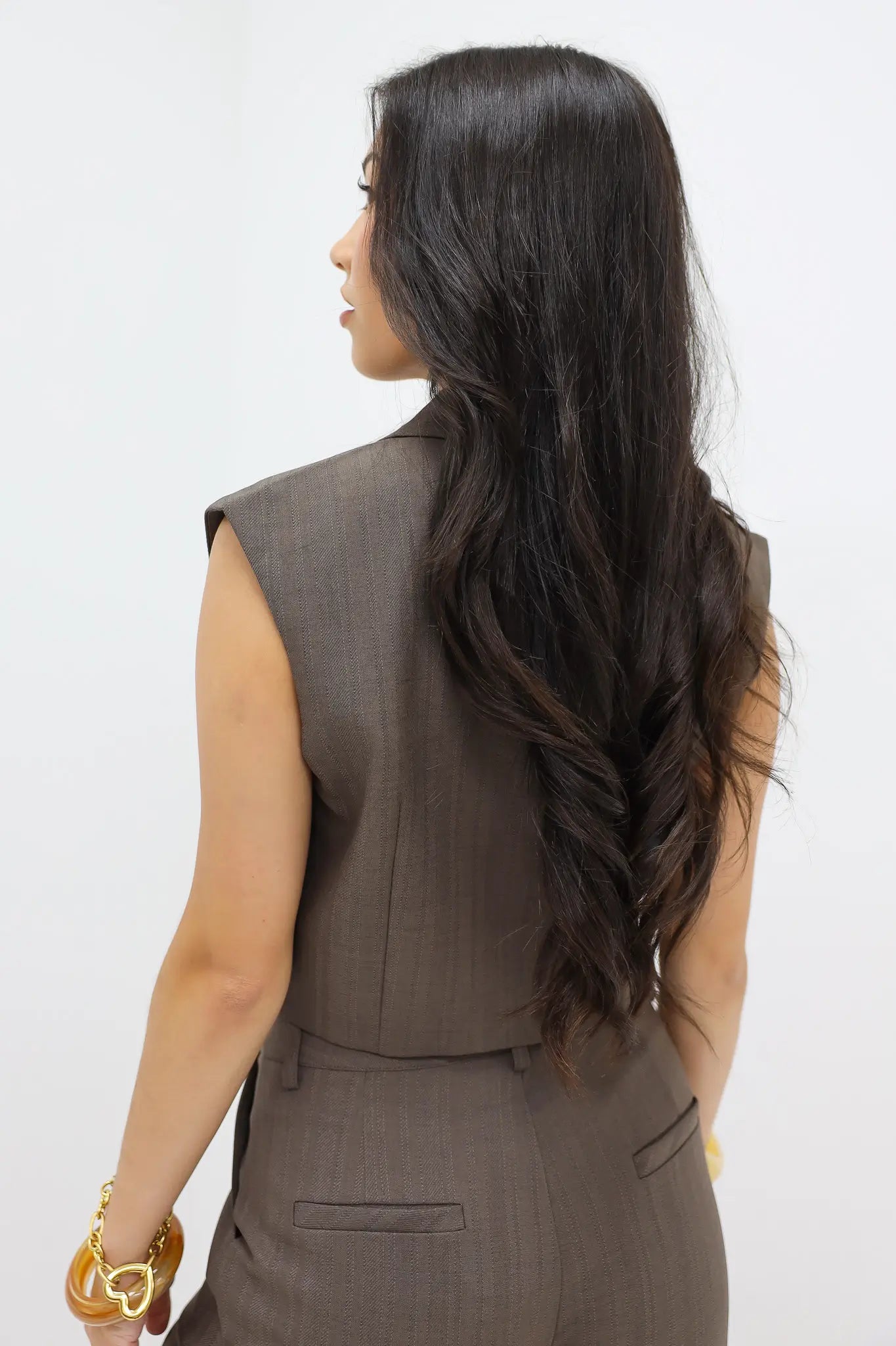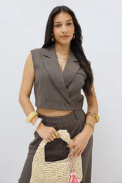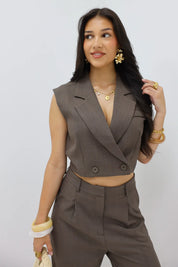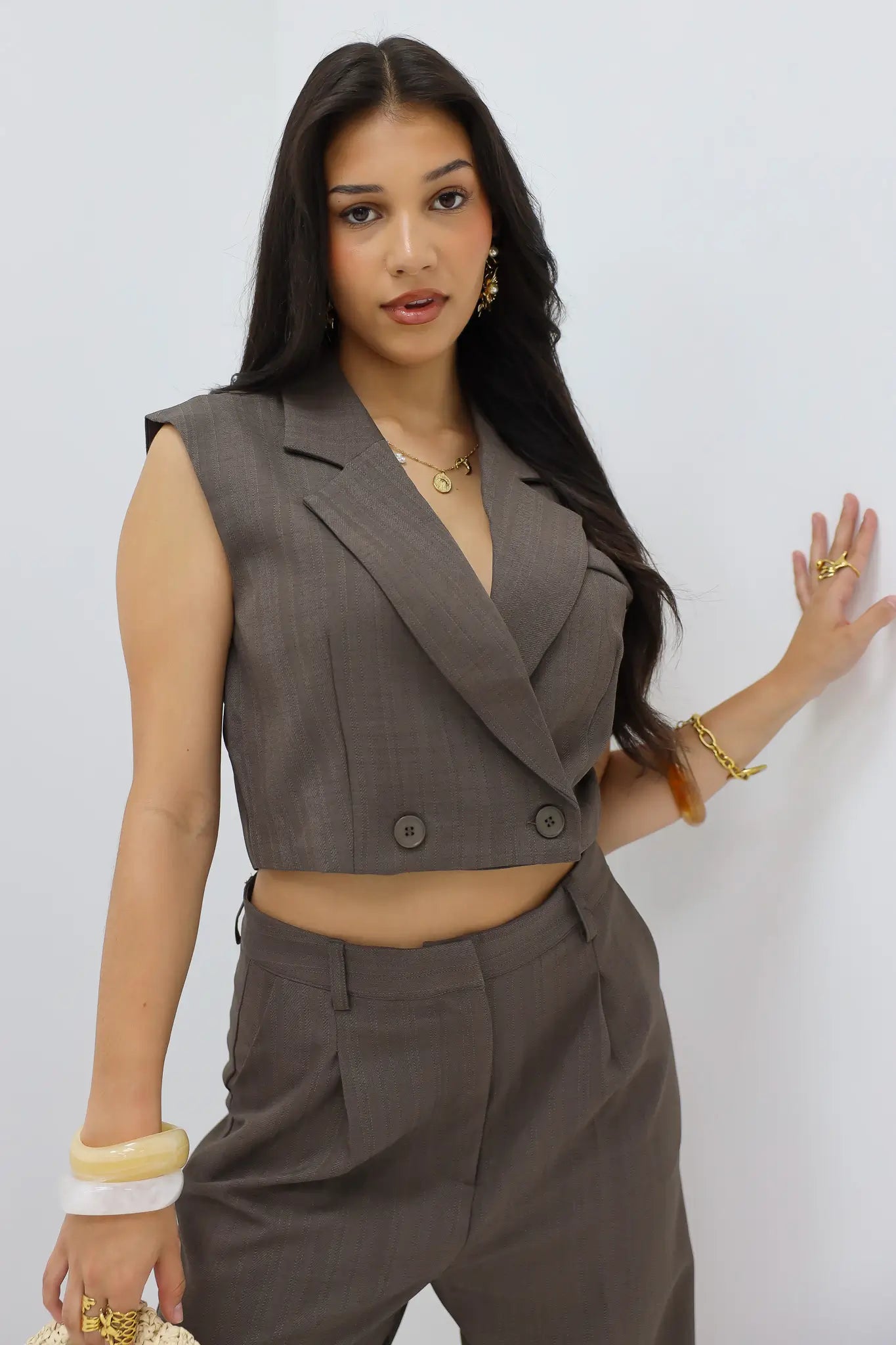 Deze cropped blazer zonder mouwen is precies wat je zoekt als je houdt van een nette maar frisse outfit. De diepe bruine kleur, klassieke reverskraag en dubbele knoopsluiting zorgen voor een nette uitstraling, maar dan met een speelse knipoog door het korte model. Combineer ’m met de bijpassende wijde pantalon voor een complete set die net even anders is. Ook leuk: los te dragen op een jeans of rok. Deze cropped blazer is nu verkrijgbaar in onze webshop én hangt in de winkel in Middelburg. Kom je passen?
